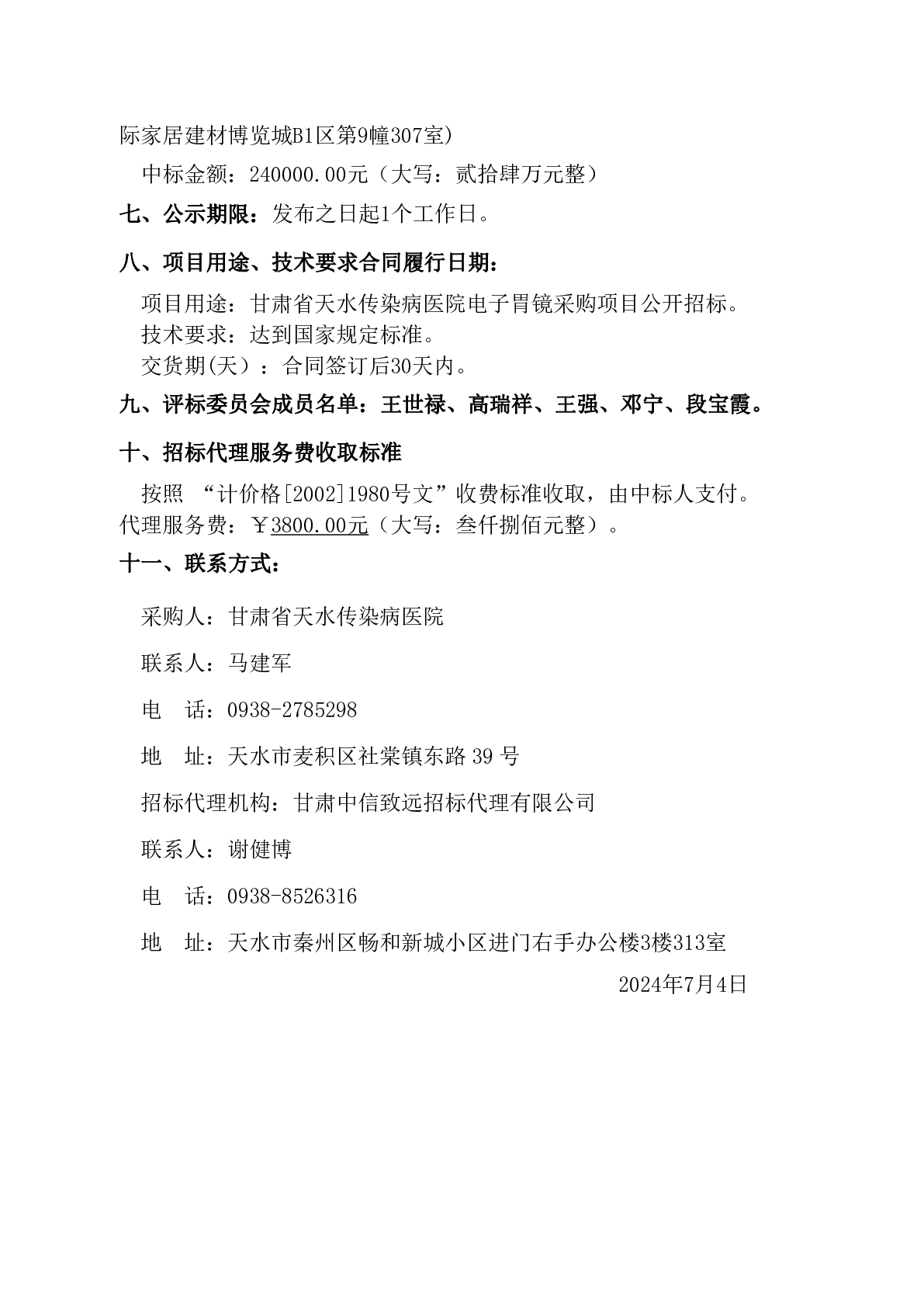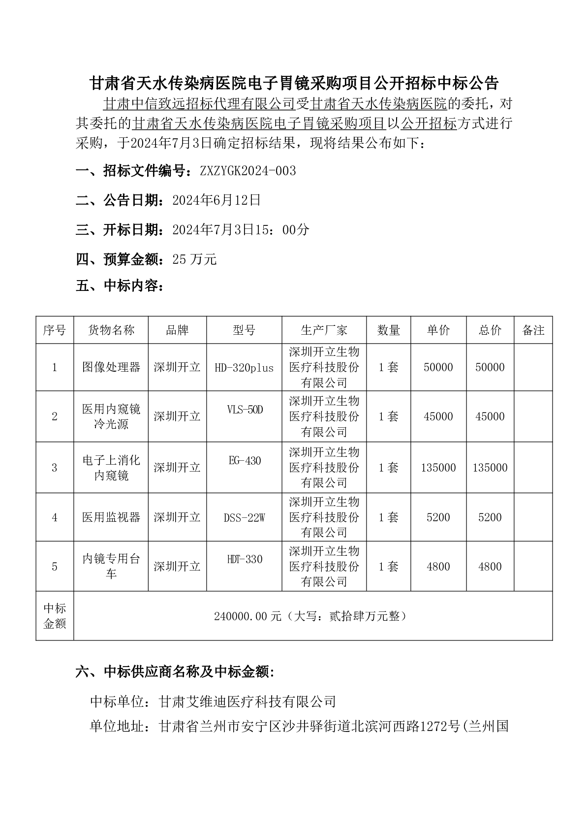甘肃省天水传染病医院电子胃镜采购项目公开招标中标公告
