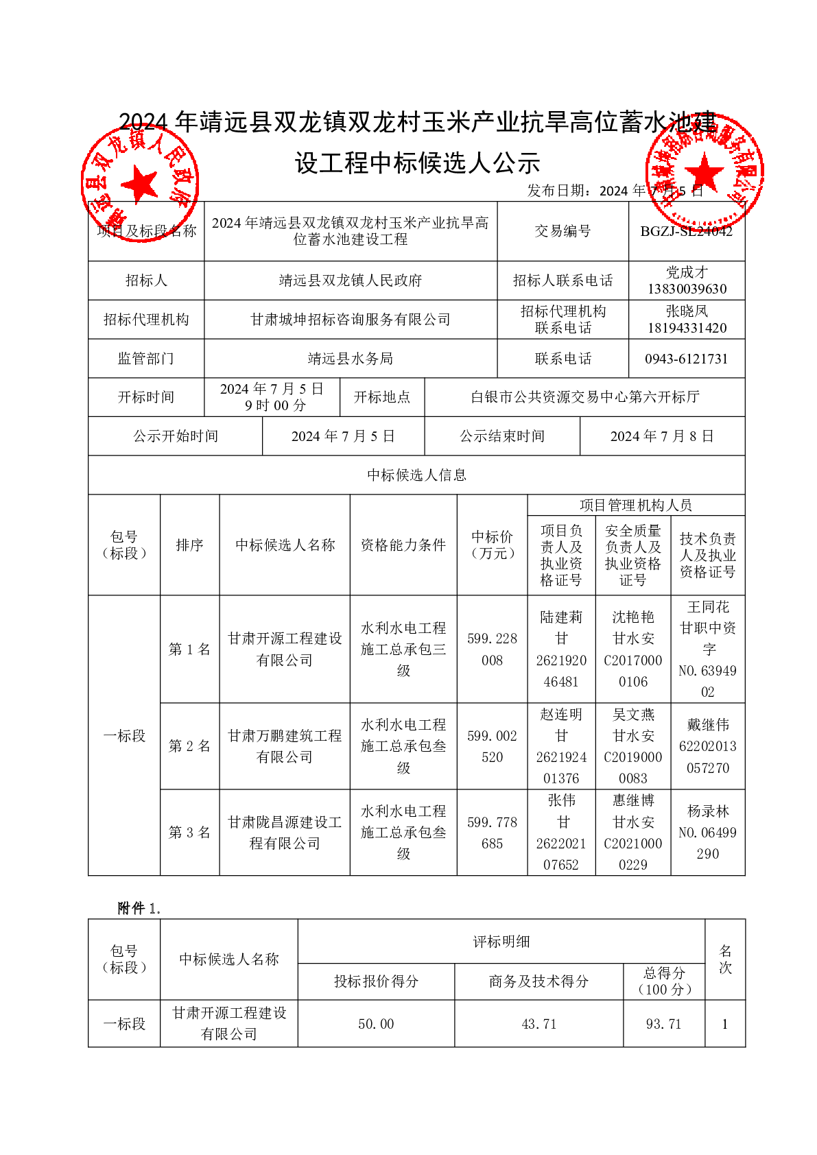 白银市2024年靖远县双龙镇双龙村玉米产业抗旱高位蓄水池建设工程