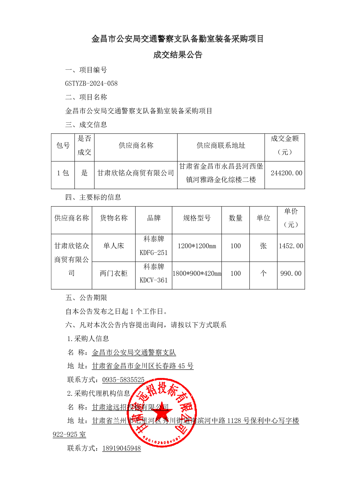 金昌市公安局交通警察支队备勤室装备采购项目成交结果公告
