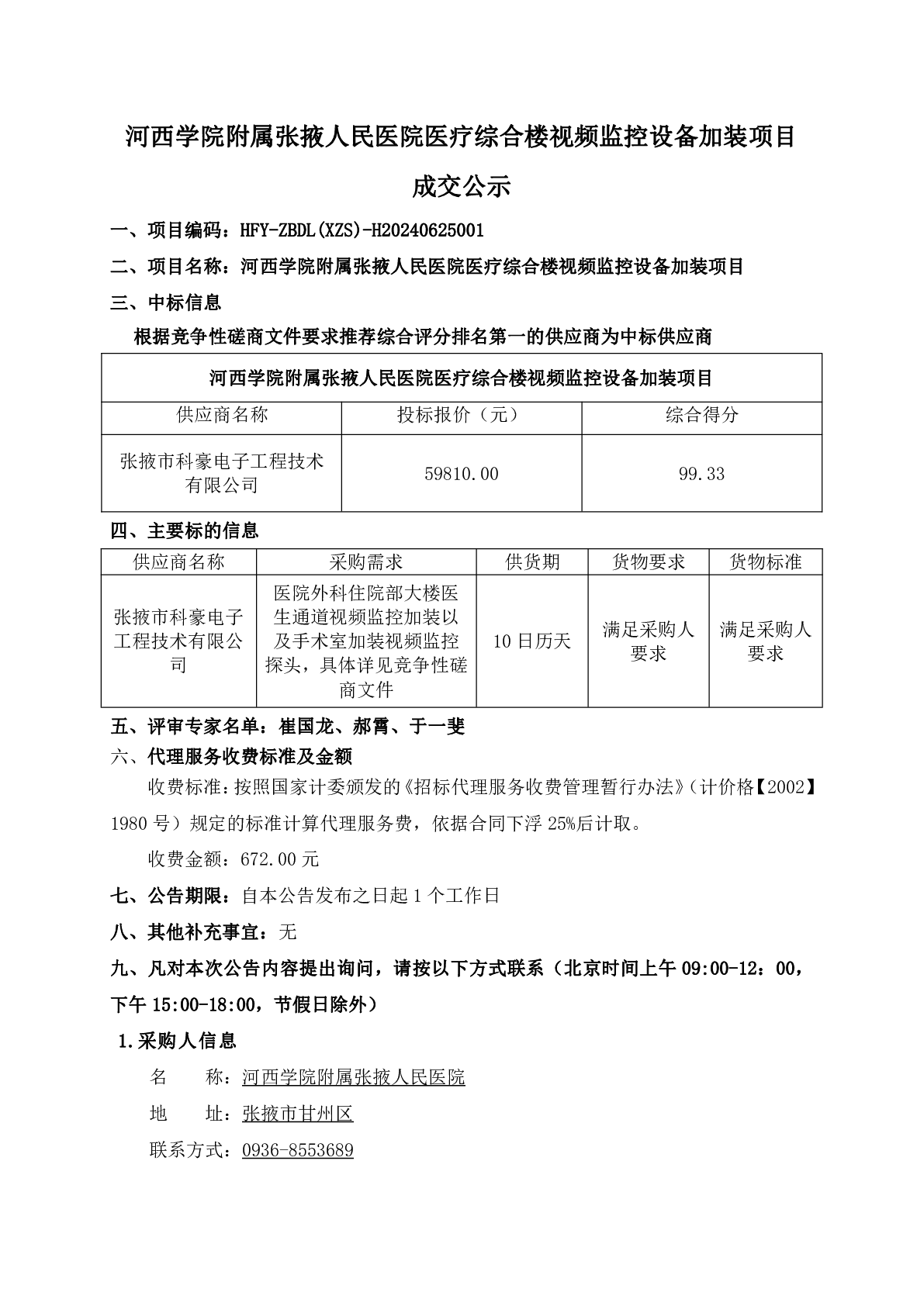 河西学院附属张掖人民医院医疗综合楼视频监控设备加装项目成交公示