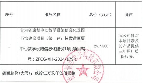 甘肃鑫禾国际招标有限公司受甘肃省康复中心委托,对甘肃省康复中心教学设施信息化及图书馆建设项目以公开招标的方式进行采购,评标委员会于2024年07月15日确定中标结果,现将中标结果公布如下: