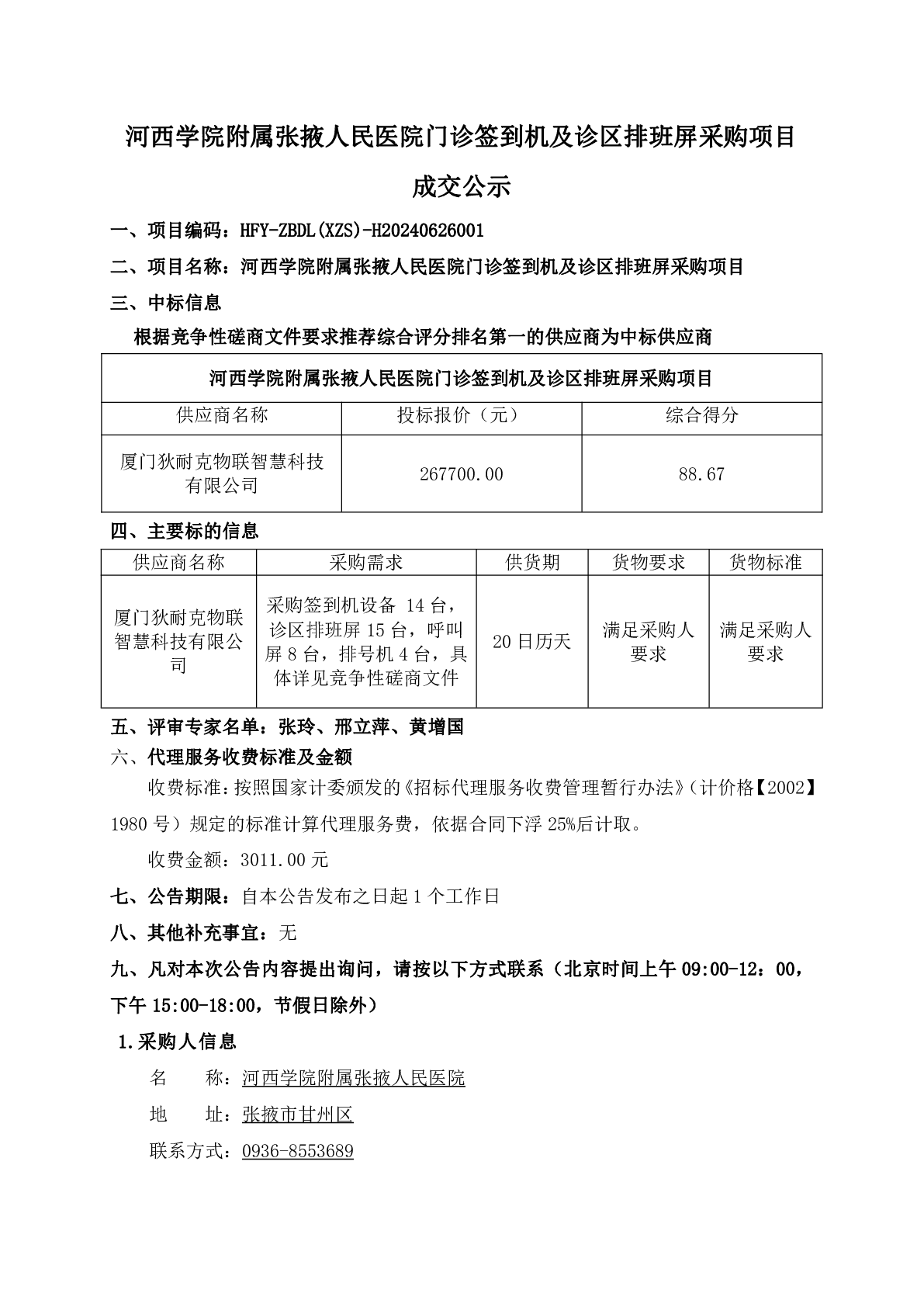 河西学院附属张掖人民医院门诊签到机及诊区排班屏采购项目成交公示