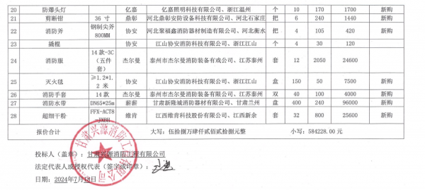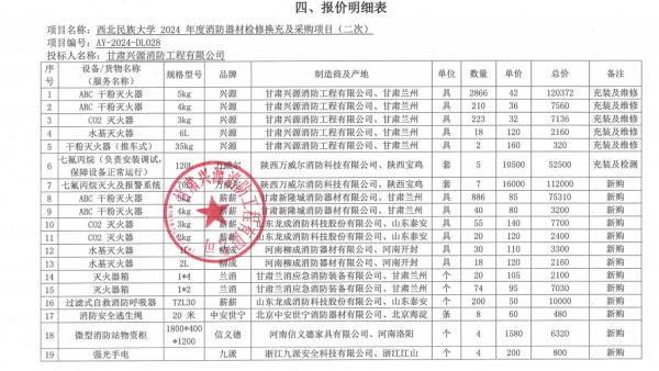 甘肃安宇工程造价咨询有限公司受西北民族大学的委托,对“西北民族大学2024年度消防器材检修换充及采购项目(二次)”以公开招标的方式进行采购,评审小组于2024年7月18日确定中标结果。现将中标结果公布如下: