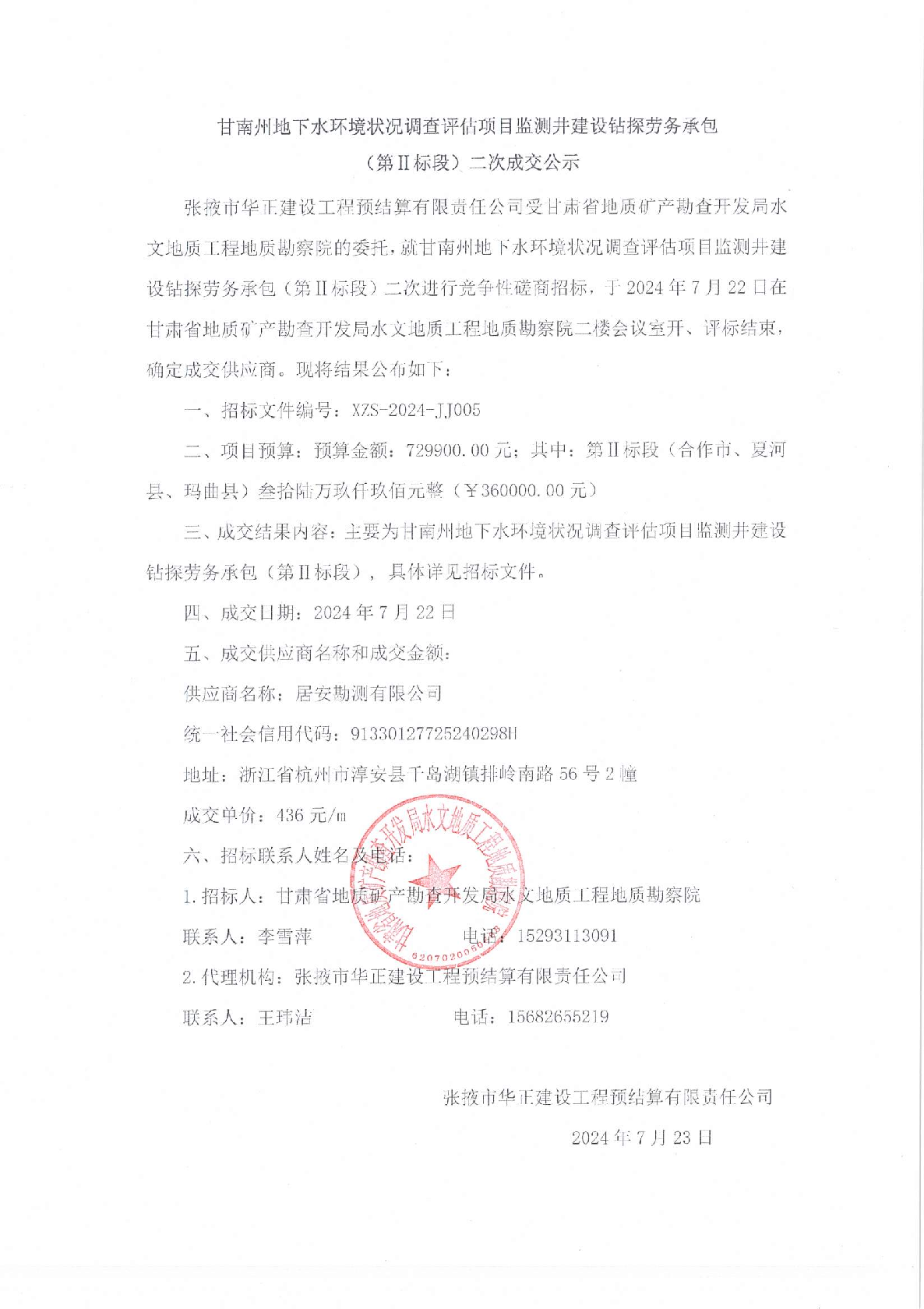 甘南州地下水环境状况调查评估项目监测井建设钻探劳务承包(第Ⅱ标段)二次成交公示