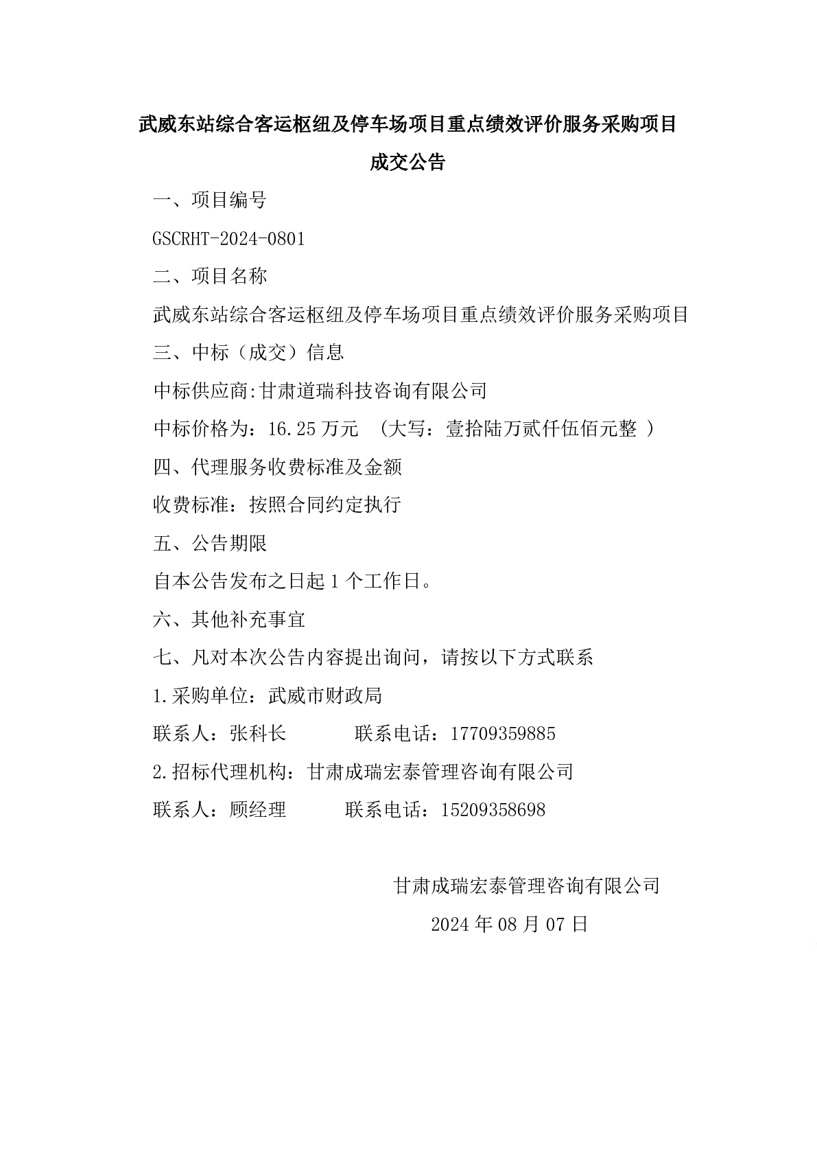 武威东站综合客运枢纽及停车场项目重点绩效评价服务采购项目成交公告