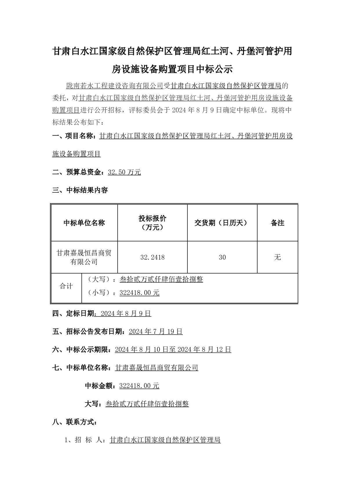 甘肃白水江国家级自然保护区管理局红土河、丹堡河管护用房设施设备购置项目中标公示