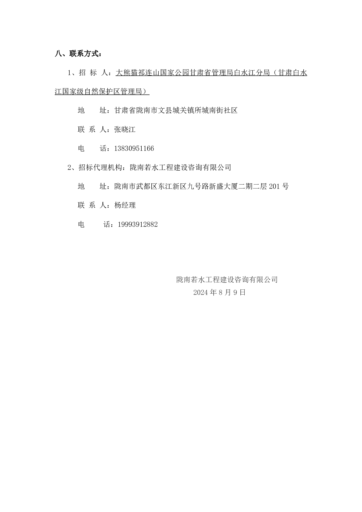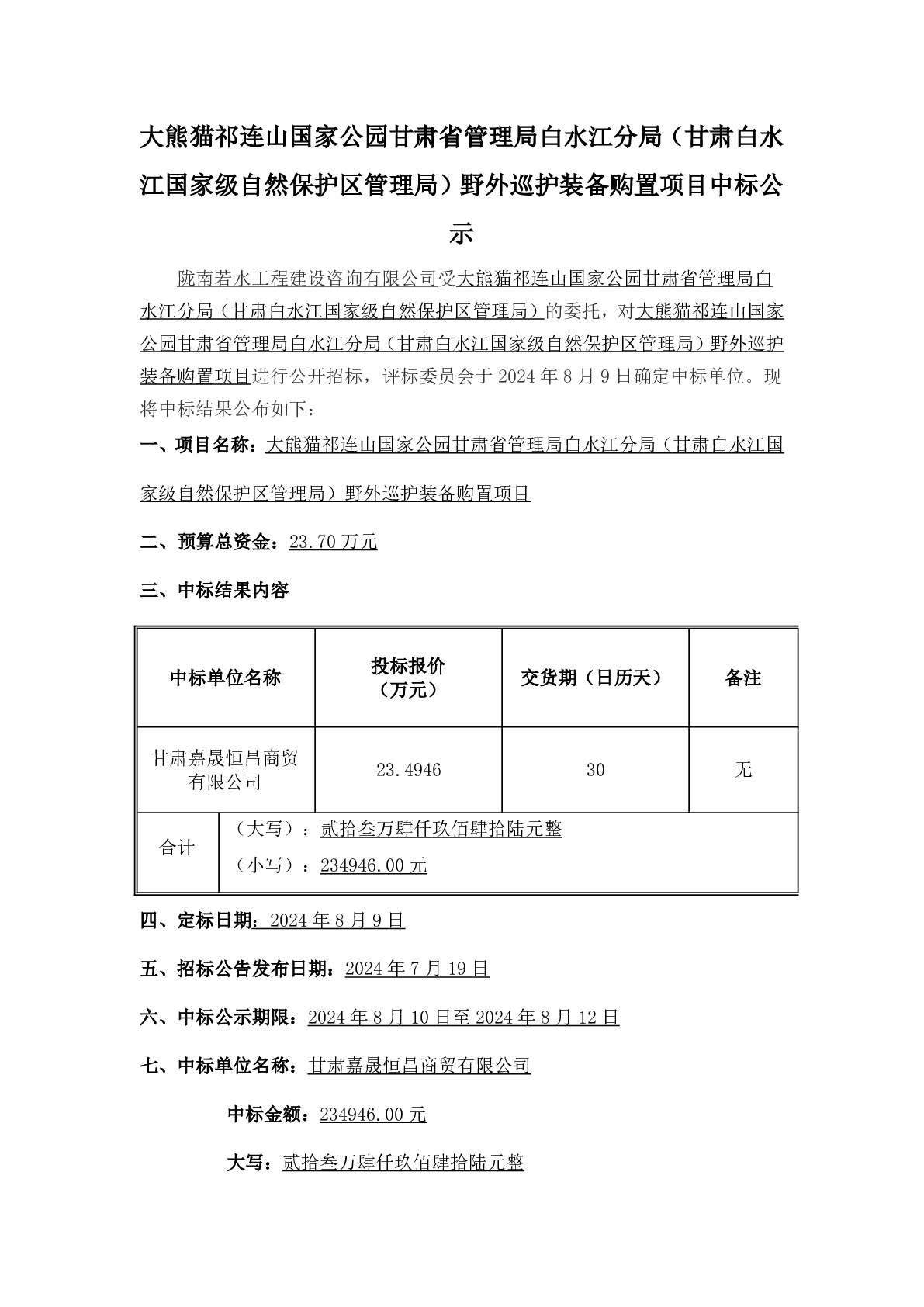 大熊猫祁连山国家公园甘肃省管理局白水江分局(甘肃白水江国家级自然保护区管理局)野外巡护装备购置项目中标公示