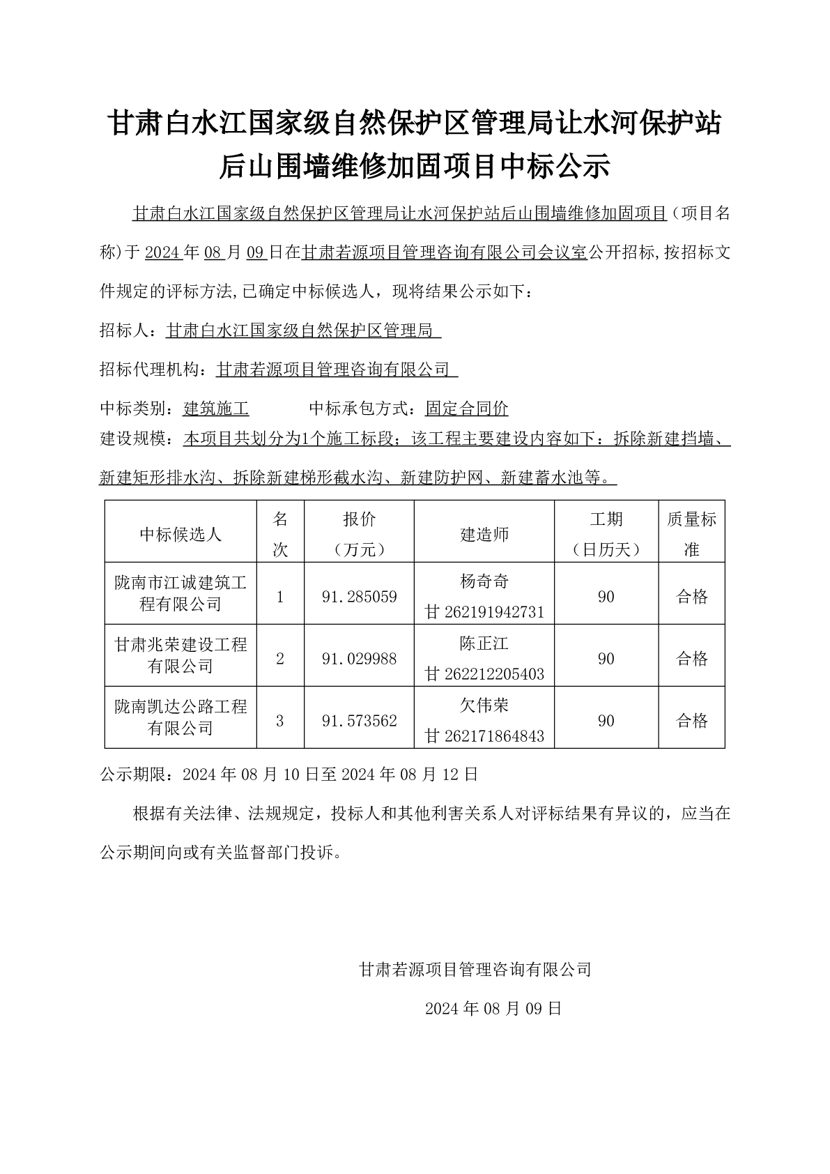甘肃白水江国家级自然保护区管理局让水河保护站后山围墙维修加固项目中标公示