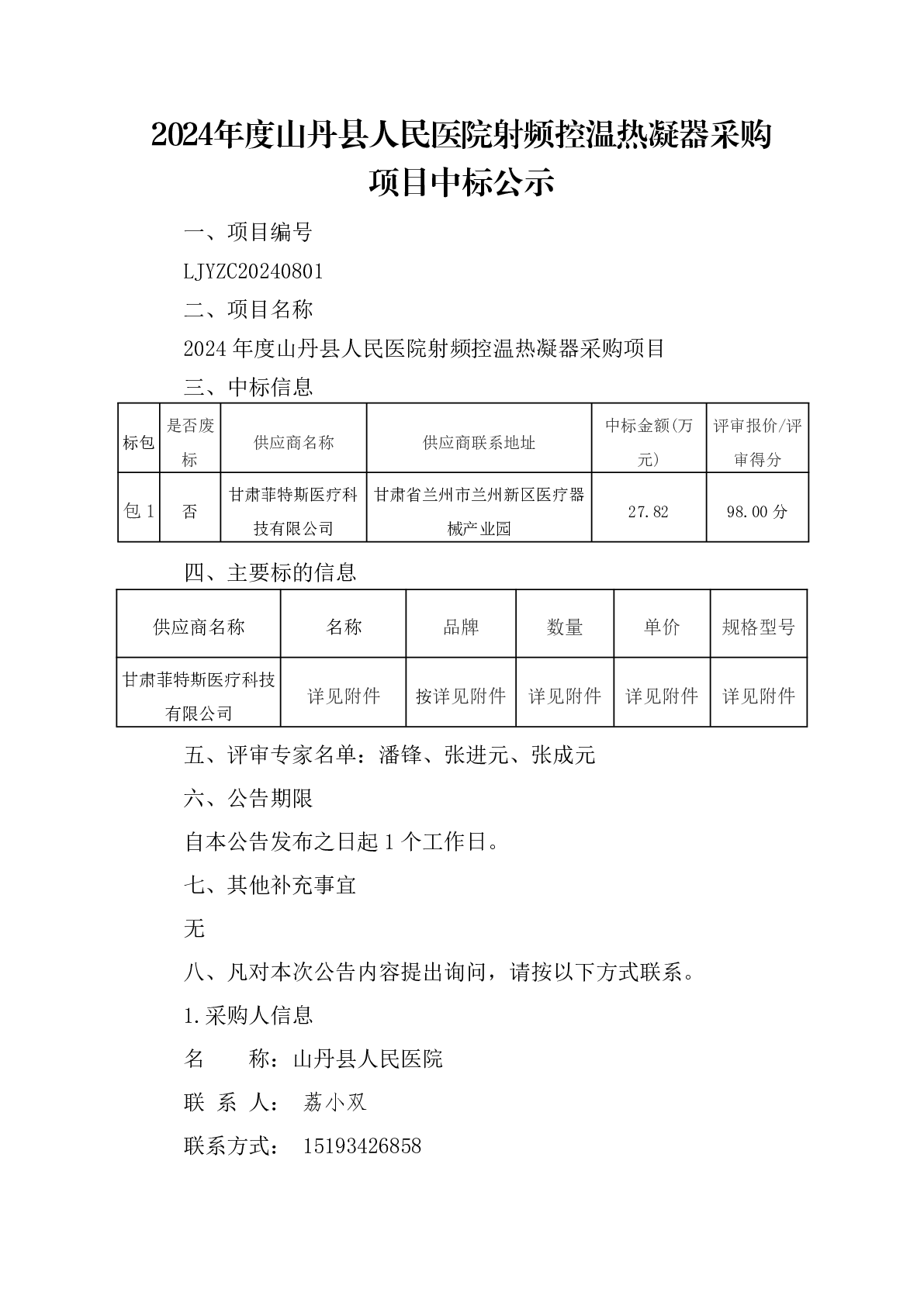 2024年度山丹县人民医院射频控温热凝器采购项目中标公示