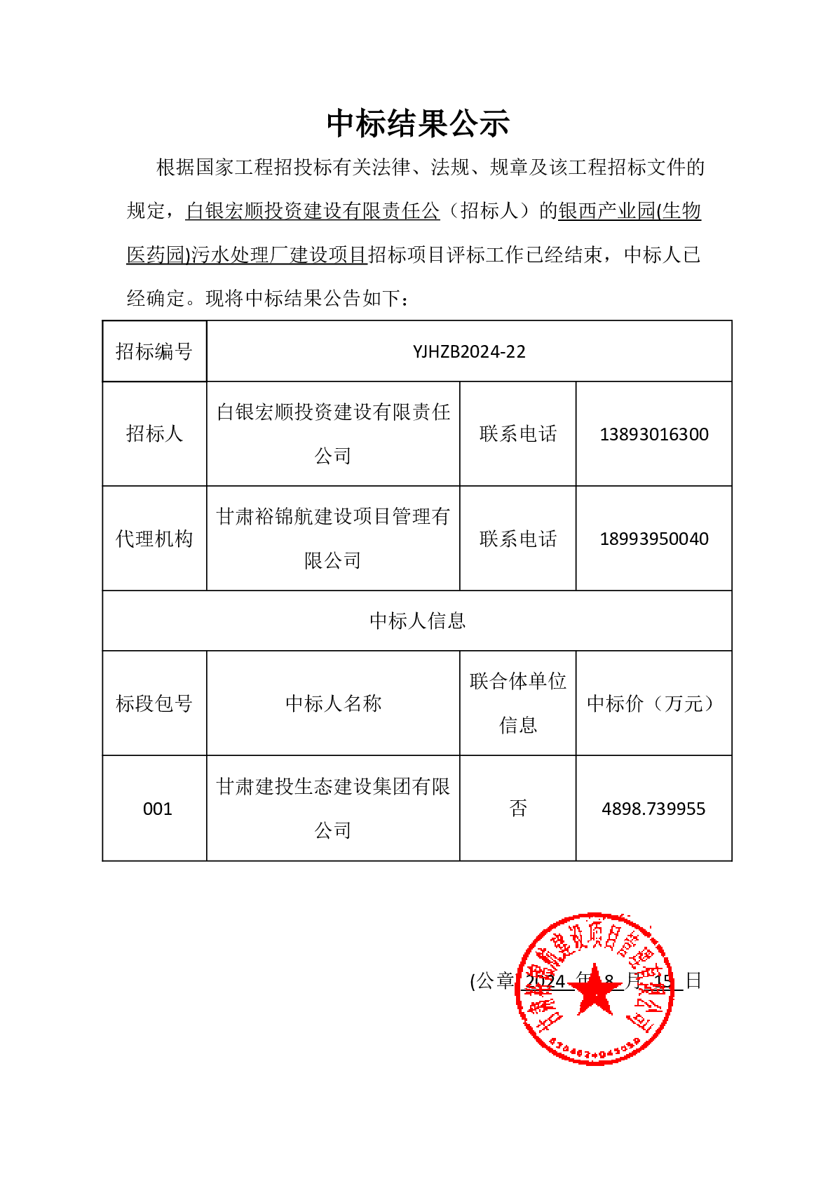 银西产业园(生物医药园)污水处理厂建设项目中标结果公示