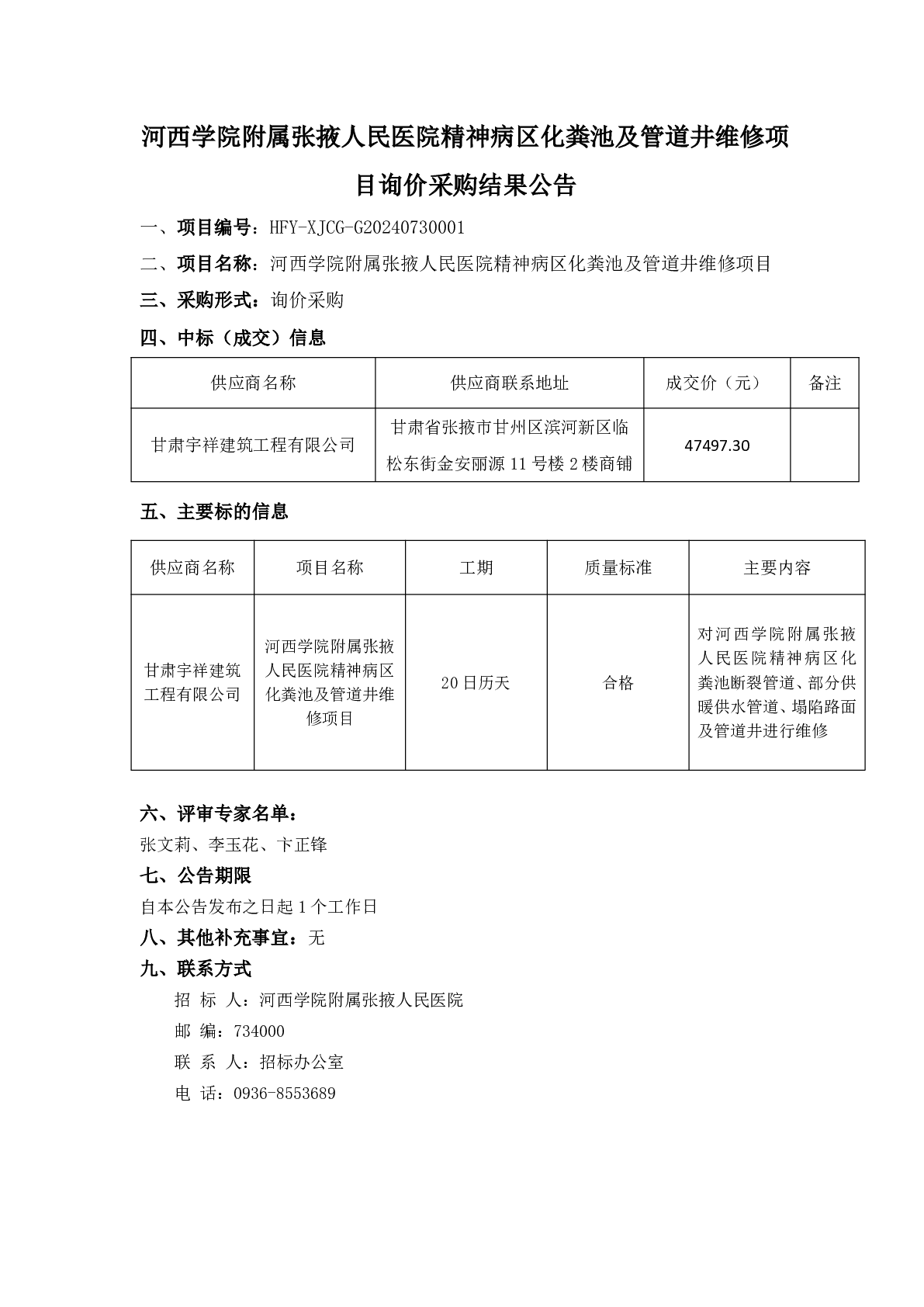 河西学院附属张掖人民医院精神病区化粪池及管道井维修项目询价采购结果公告