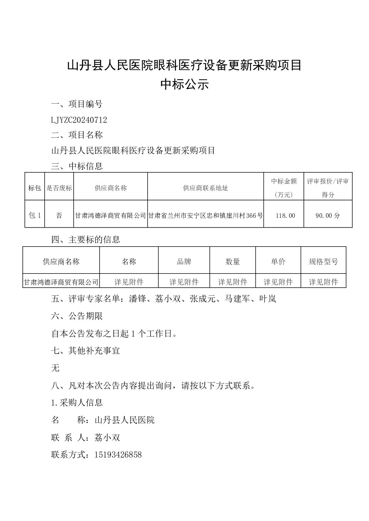 山丹县人民医院眼科医疗设备更新采购项目中标公示