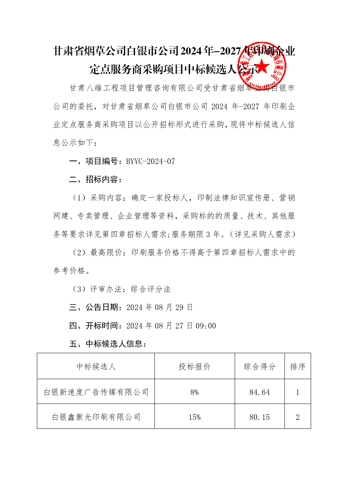 甘肃省烟草公司白银市公司 2024 年-2027年印刷企业 定点服务商采购项目