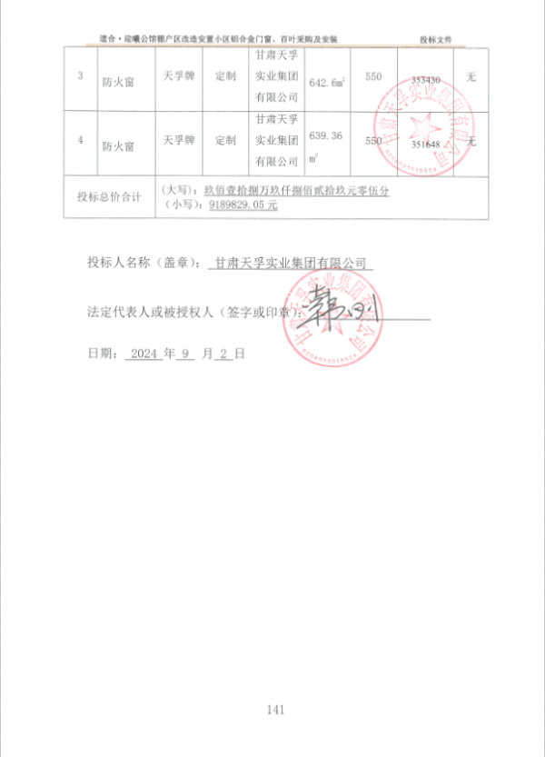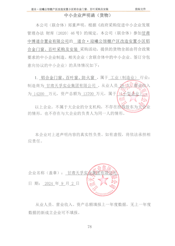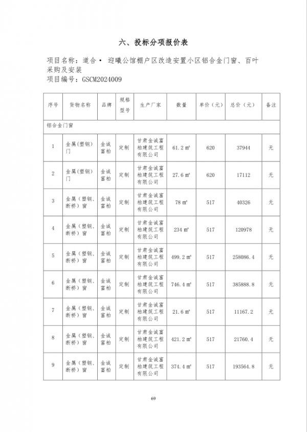 甘肃船马项目管理有限公司受甘肃中博道合置业有限公司的委托,对道合·迎曦公馆棚户区改造安置小区铝合金门窗、百叶采购及安装进行公开招标,评标委员会于2024年9月2日确定中标结果,现将结果内容公示如下: