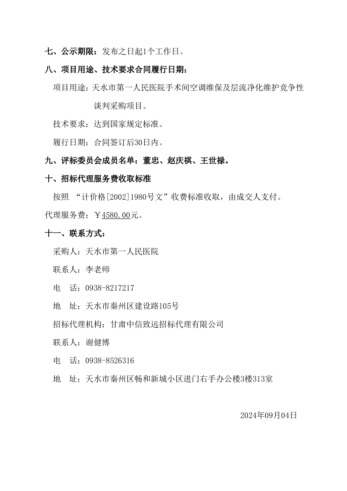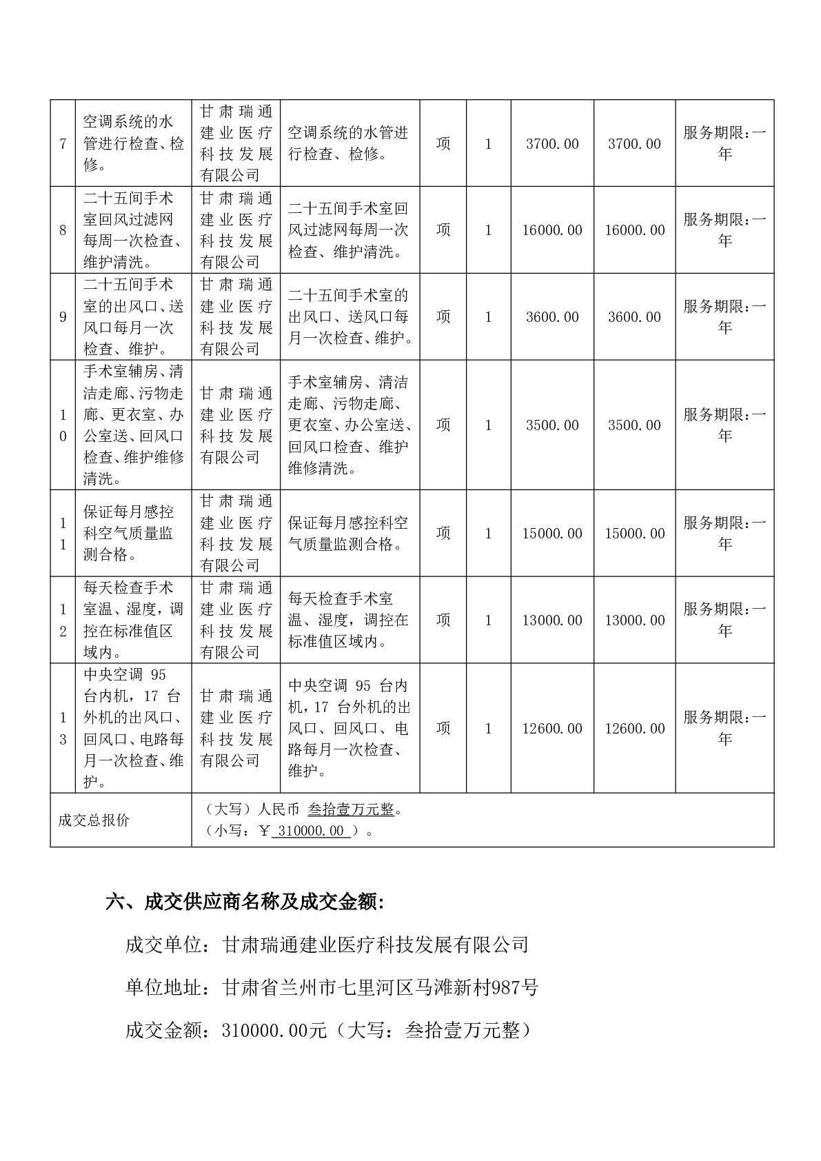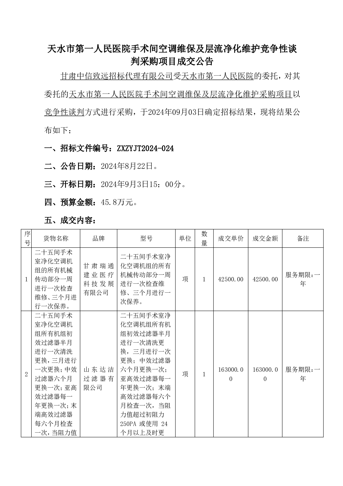 天水市第一人民医院手术间空调维保及层流净化维护竞争性谈判采购项目成交公告