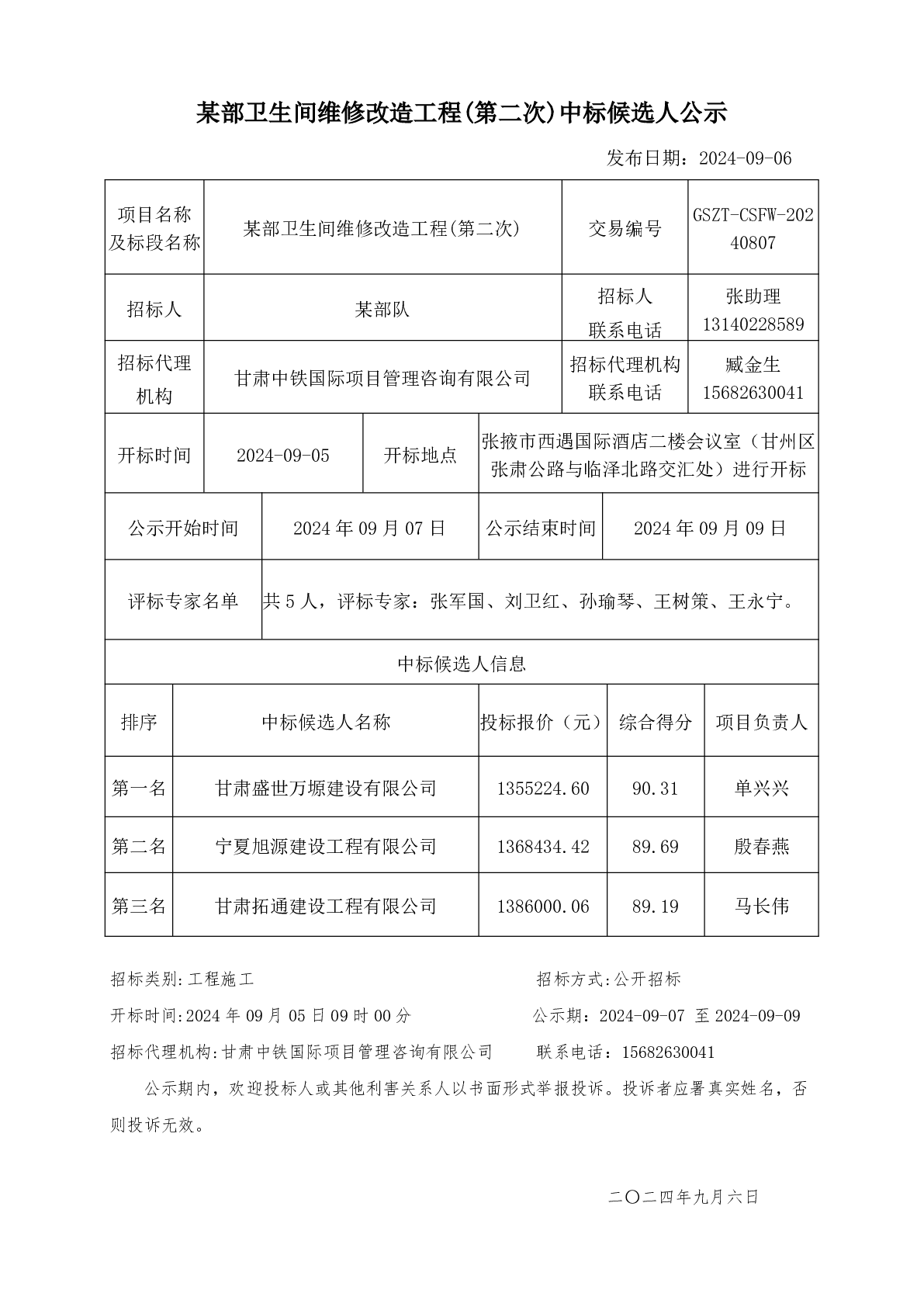 某部卫生间维修改造工程(第二次)中标候选人公示