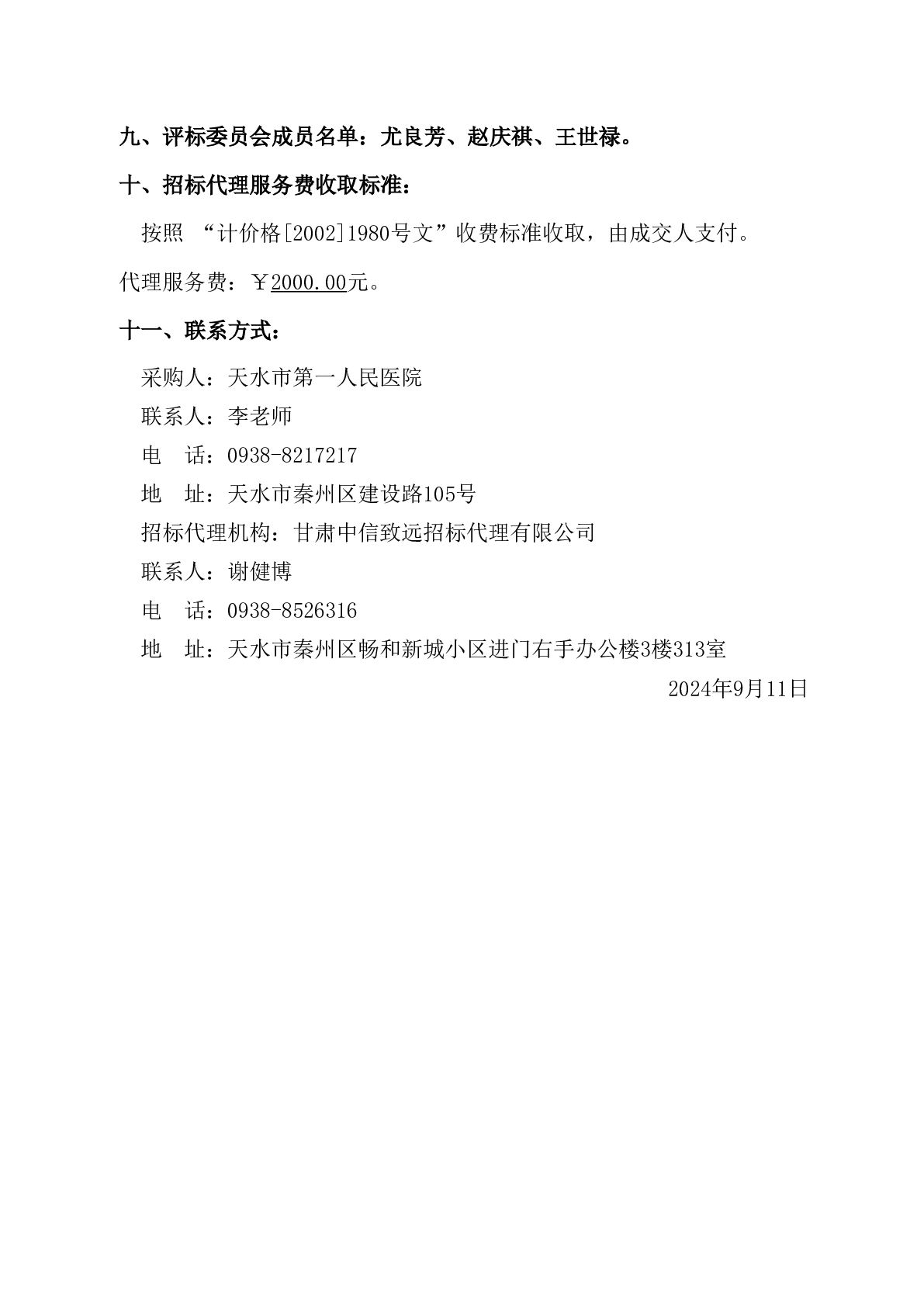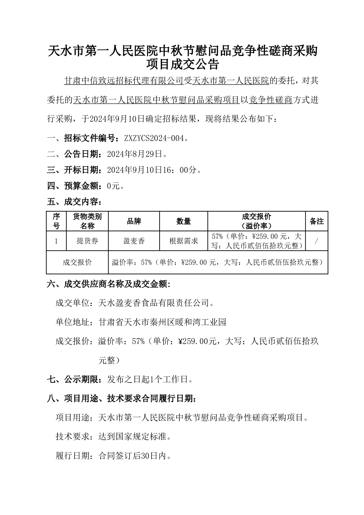天水市第一人民医院中秋节慰问品竞争性磋商采购项目成交公告