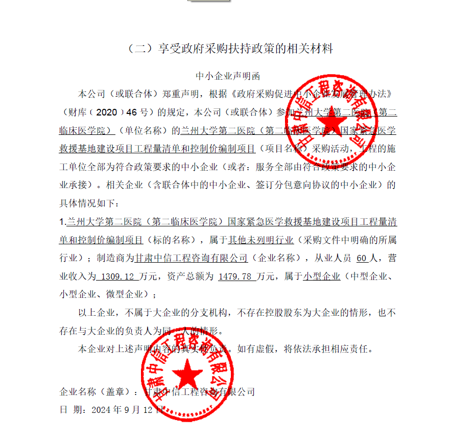 甘肃中金国际招标有限公司受兰州大学第二医院的委托,对“兰州大学第二医院(第二临床医学院)国家紧急医学救援基地建设项目工程量清单和控制价编制”以公开招标的方式进行采购,评标小组于2024年9月12日确定中标结果。现将中标结果公布如下: