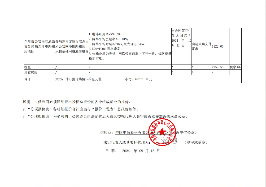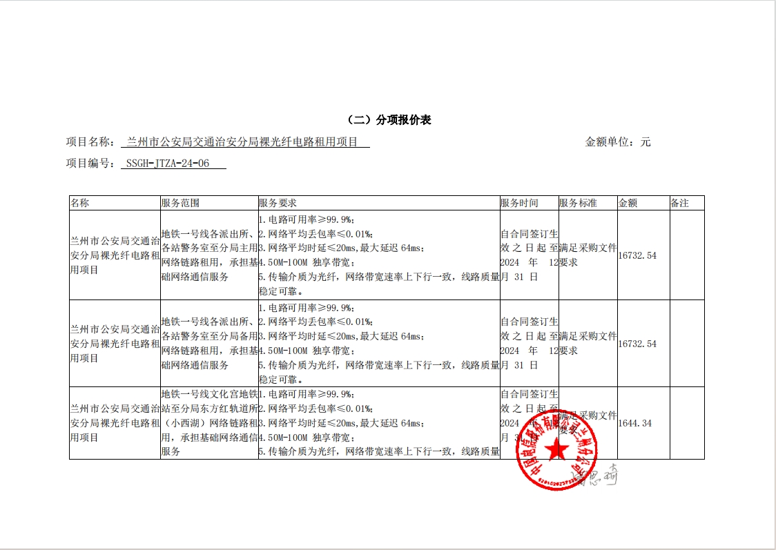 中国电信股份有限公司兰州分公司 | 兰州市公安局交通治安分局裸光纤电路租用项目 | 详见附件 | 详见附件 | 详见附件 | 详见附件 |