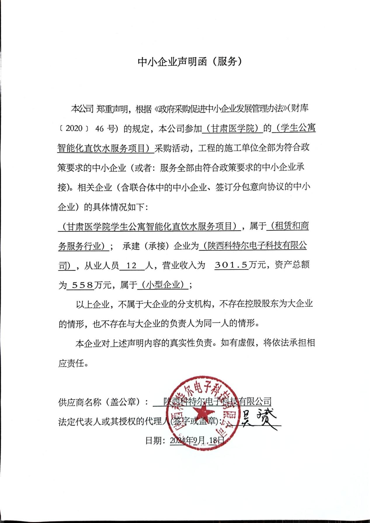 甘肃医学院学生公寓智能化直饮水服务项目 | 甘肃医学院学生公寓智能化直饮水服务 | 详见磋商文件服务及技术要求 | 合同期为3年,采取1+1+1模式签订合同,具体时间以签订合同为准, | 合格 |