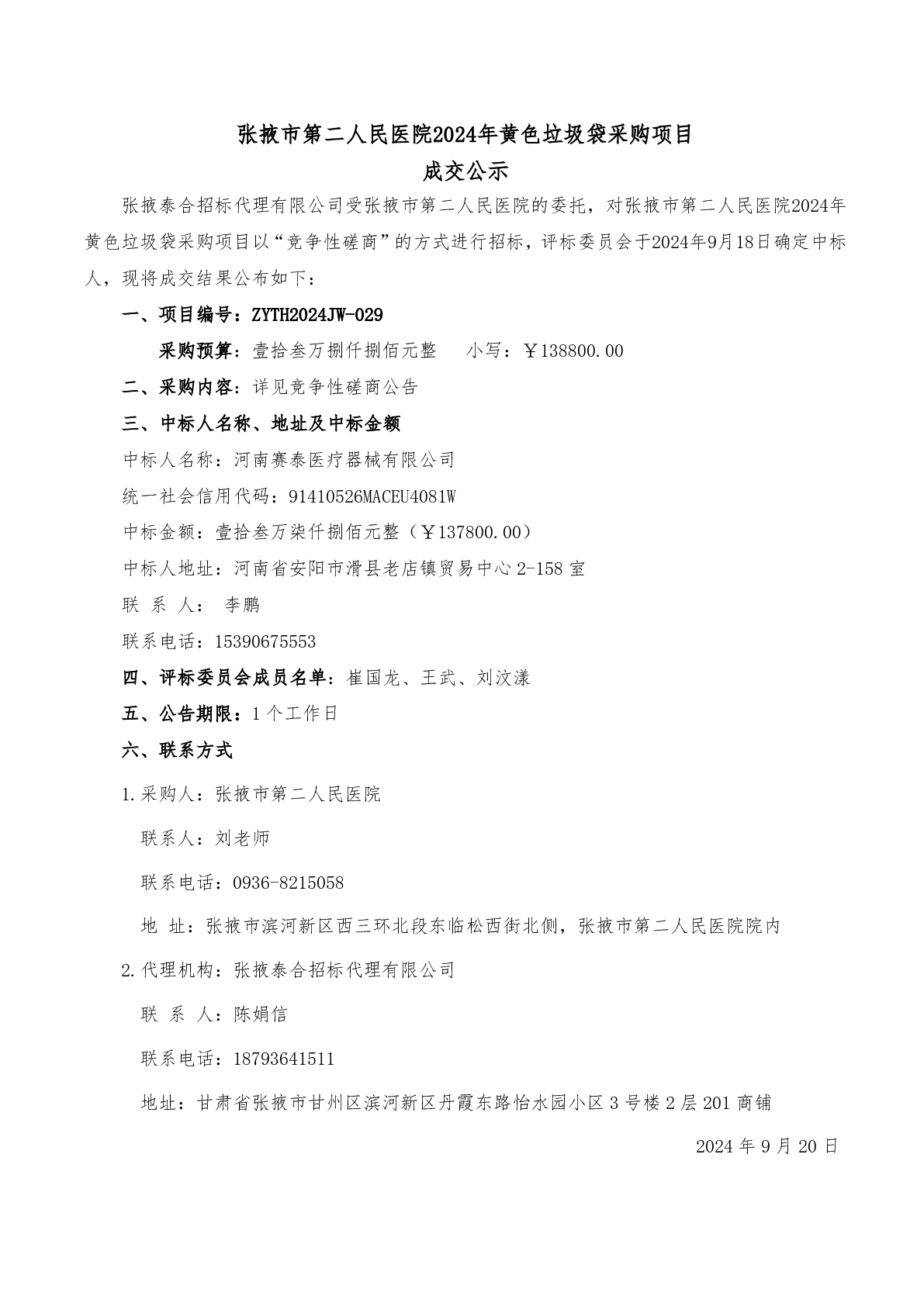 张掖市第二人民医院2024年黄色垃圾袋采购项目成交公示