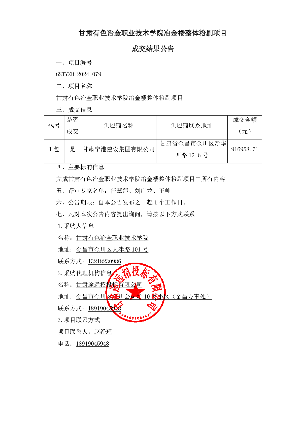 甘肃有色冶金职业技术学院冶金楼整体粉刷项目成交结果公告
