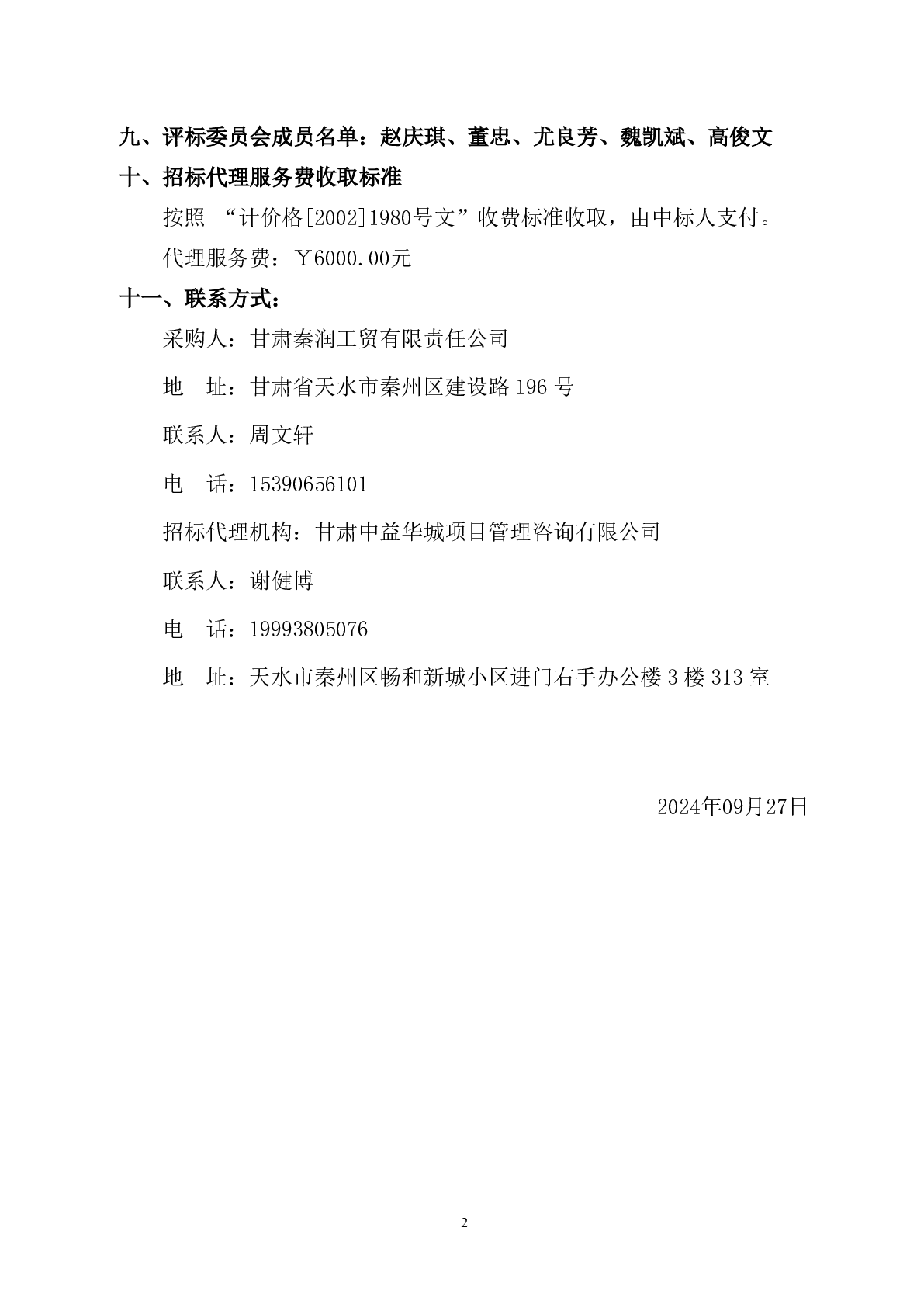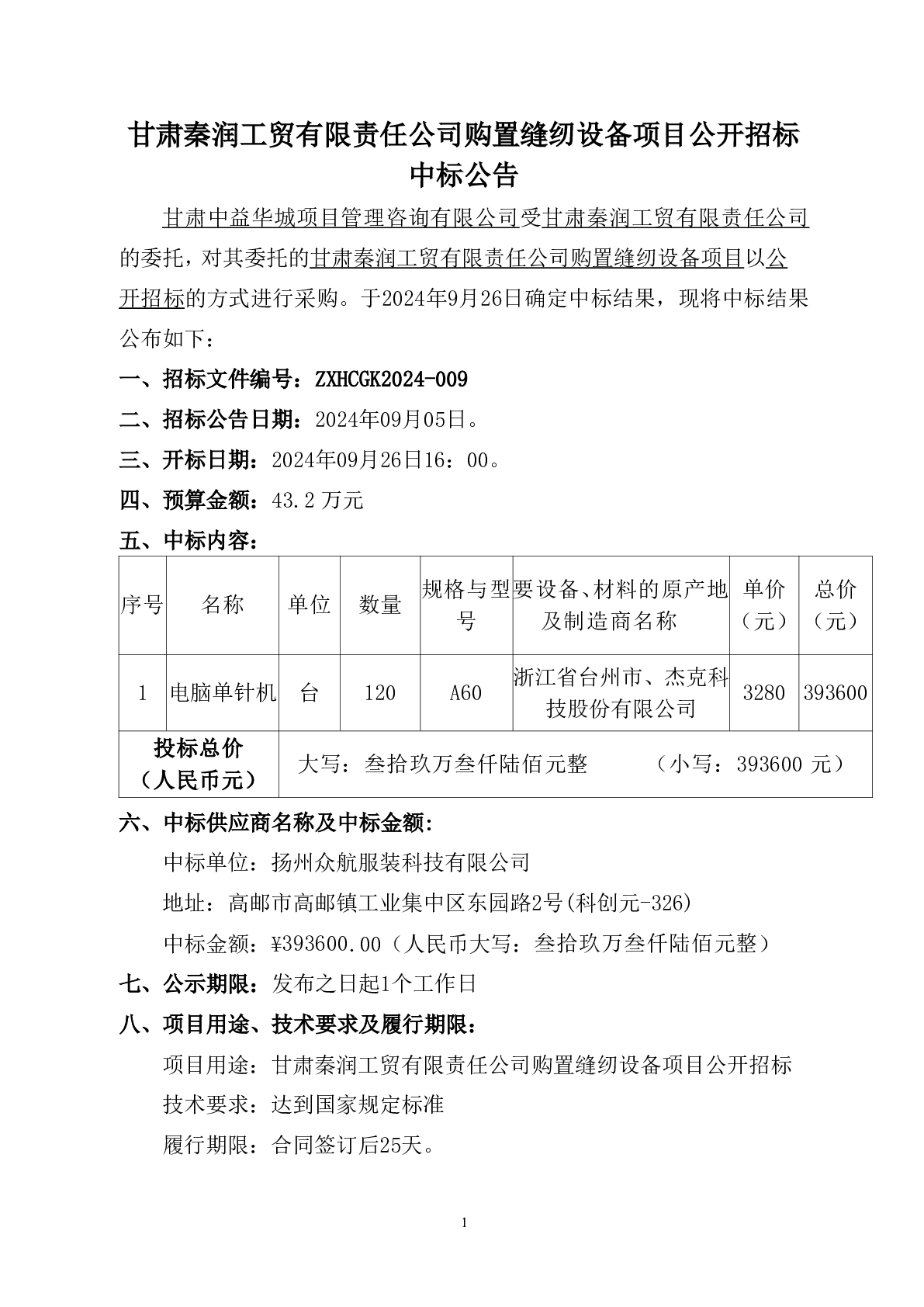 甘肃秦润工贸有限责任公司购置缝纫设备项目公开招标中标公告