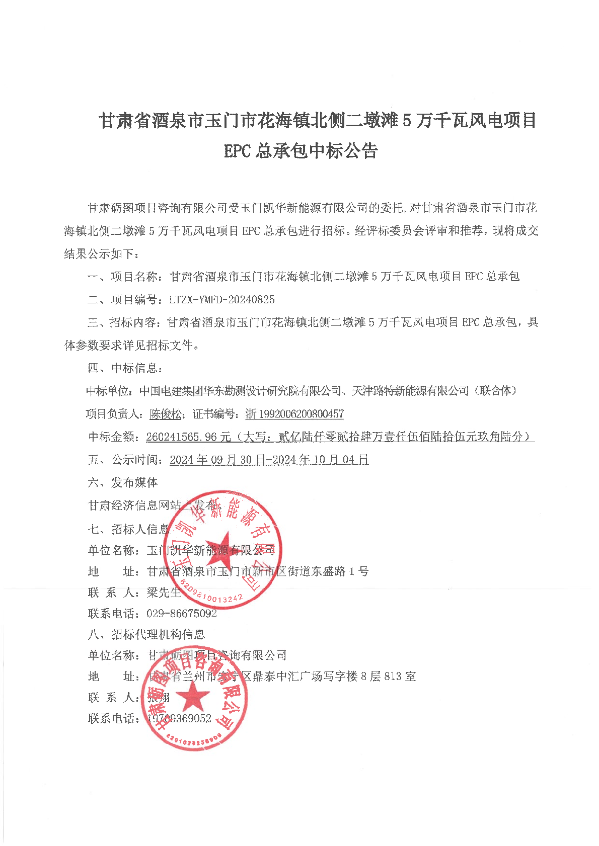 甘肃省酒泉市玉门市花海镇北侧二墩滩5万千瓦风电项目EPC总承包中标公告