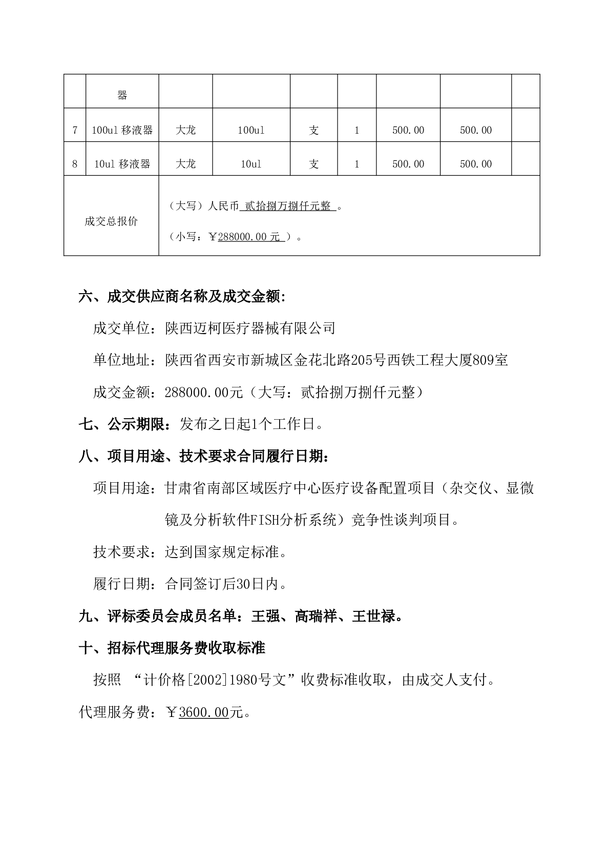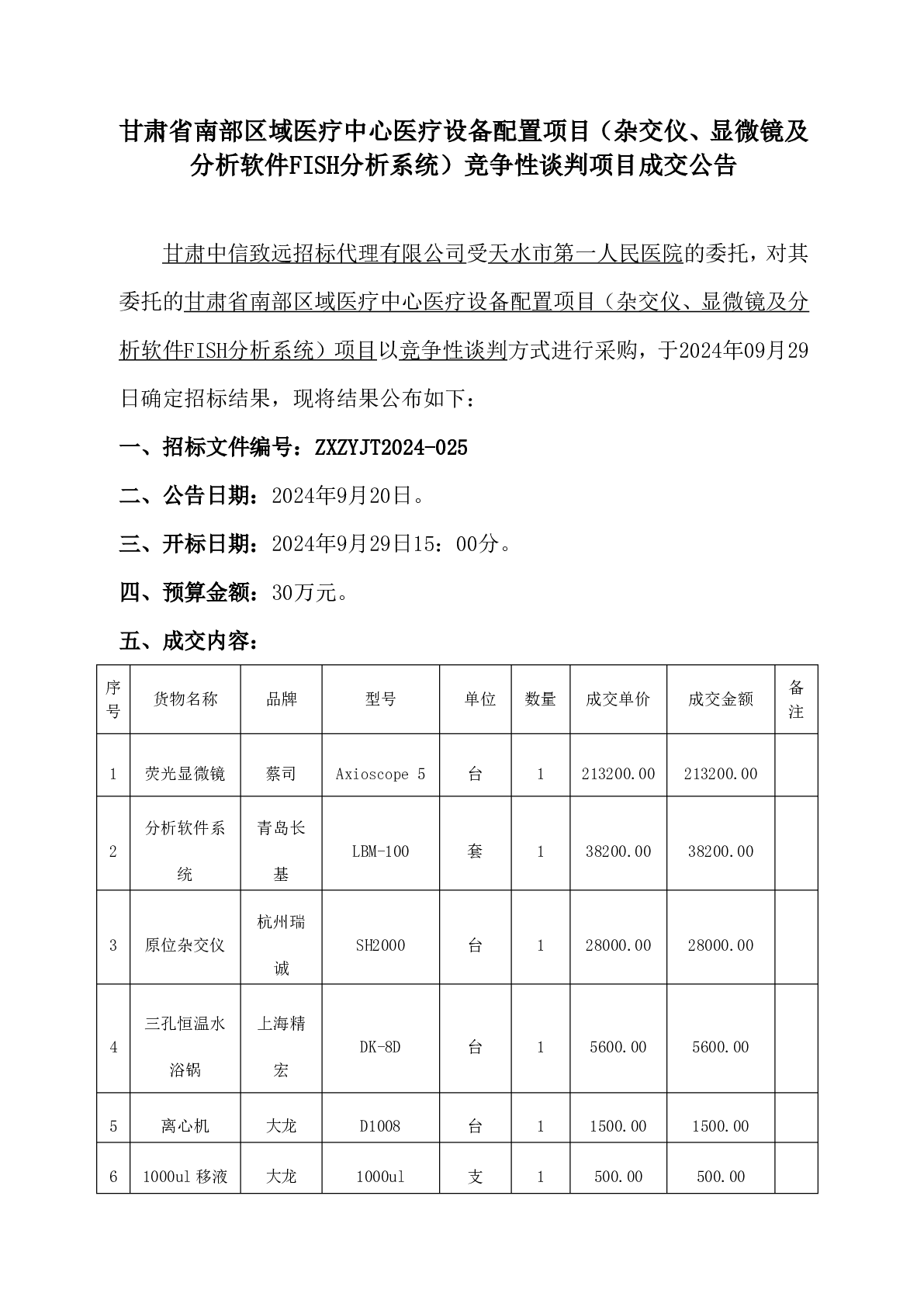 甘肃省南部区域医疗中心医疗设备配置项目(杂交仪、显微镜及分析软件FISH分析系统)竞争性谈判项目成交公告