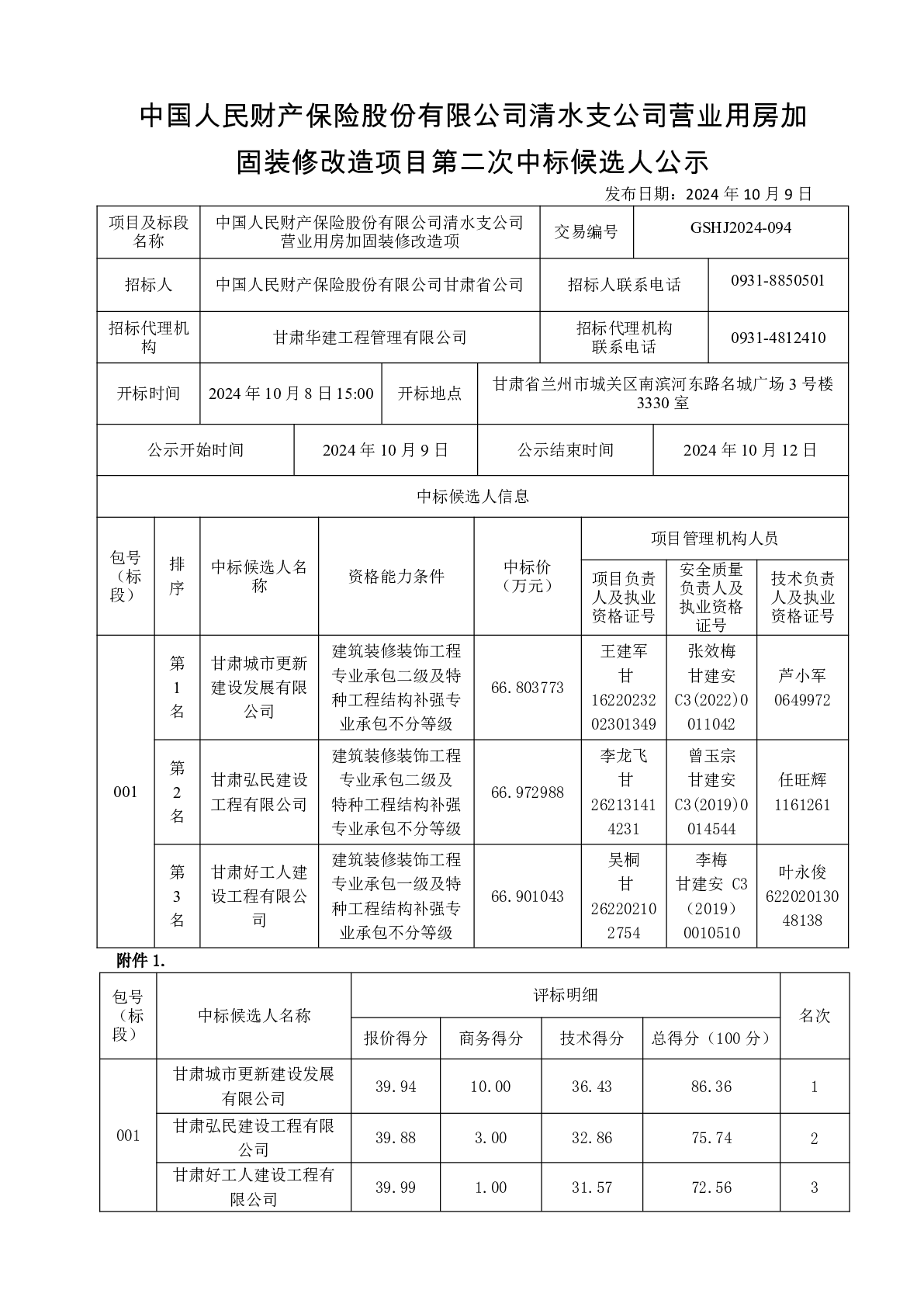 中国人民财产保险股份有限公司清水支公司营业用房加固装修改造项目第二次中标候选人公示
