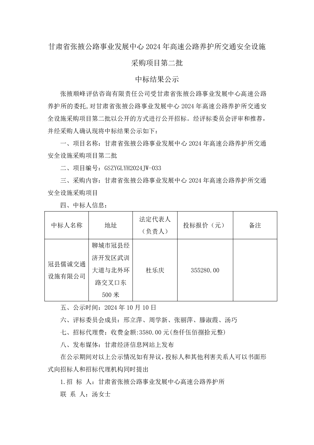 甘肃省张掖公路事业发展中心2024年高速公路养护所交通安全设施采购项目第二批中标公示