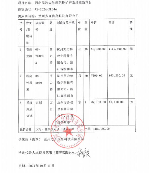 甘肃安宇工程造价咨询有限公司受西北民族大学的委托,对“西北民族大学舞蹈楼扩声系统更新项目”以竞争性磋商的方式进行采购,磋商小组于2024年10月11日确定成交结果。现将成交结果公布如下: