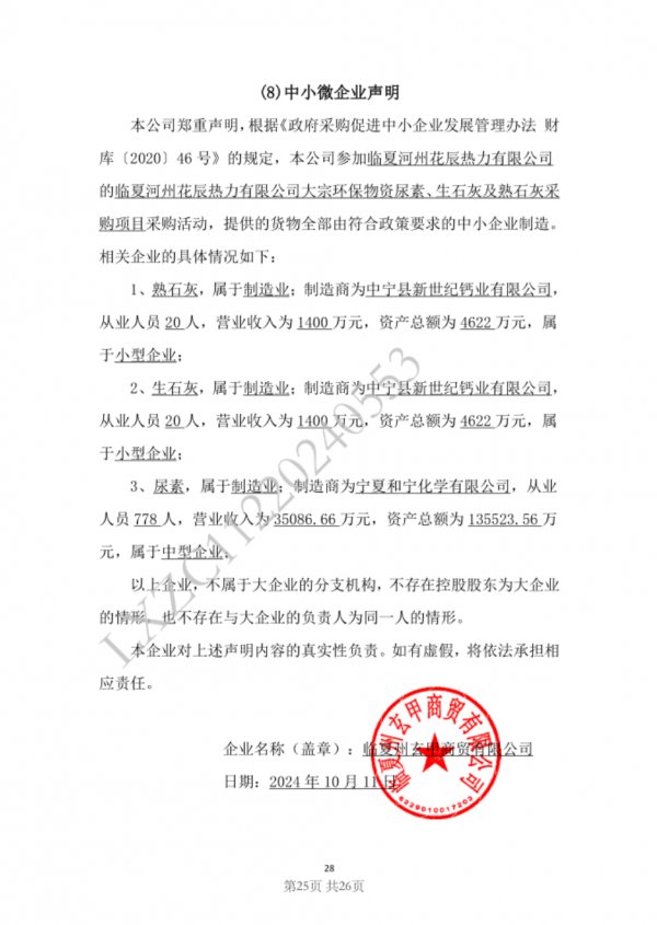 项目名称:临夏河州花辰热力有限公司大宗环保物资尿素、生石灰及熟石灰采购项目