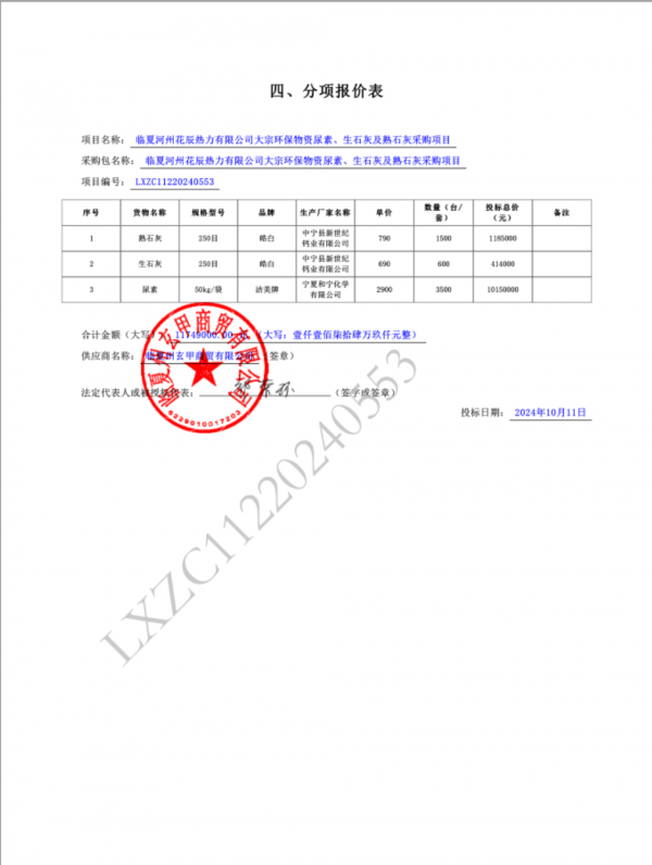 甘肃圆方星辰项目咨询有限公司受临夏河州花辰热力有限公司的委托就临夏河州花辰热力有限公司大宗环保物资尿素、生石灰及熟石灰采购项目以公开招标的方式进行采购,评标委员会于2024年10月11日确定中标结果。现将中标结果公布如下: