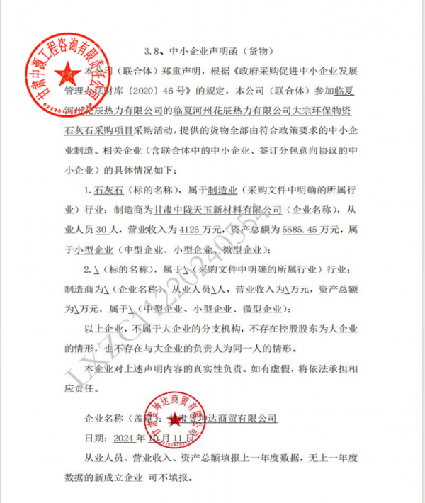 甘肃中源工程咨询有限责任公司受临夏河州花辰热力有限公司 的委托就临夏河州花辰热力有限公司大宗环保物资石灰石采购项目 以公开招标的方式进行采购,评标委员会于 2024 年 10 月 11 日确定 中标结果。现将中标结果公布如下: