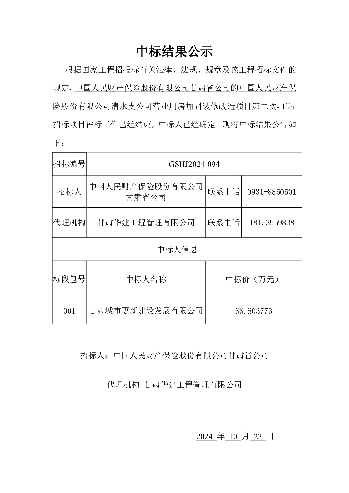 中国人民财产保险股份有限公司清水支公司营业用房加固装修改造项目第二次中标结果公示