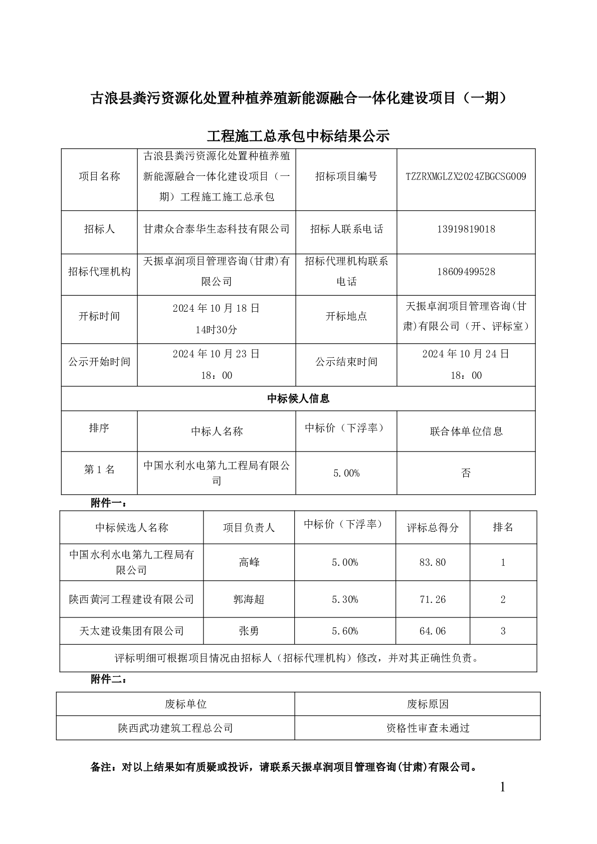 古浪县粪污资源化处置种植养殖新能源融合一体化建设项目(一期)工程施工总承包中标结果公示