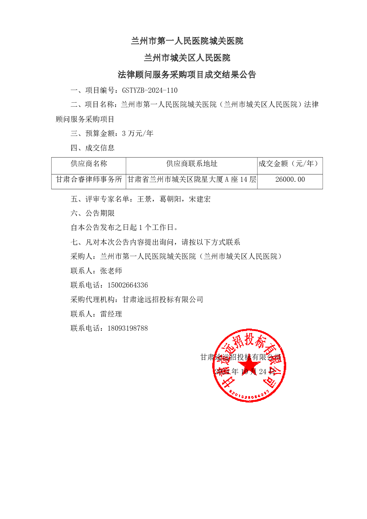 兰州市第一人民医院城关医院(兰州市城关区人民医院)法律顾问服务采购项目成交结果公告