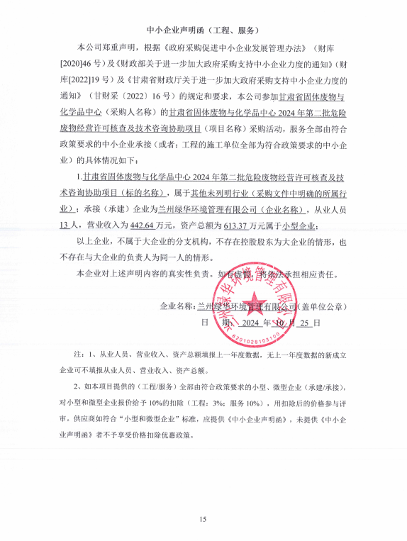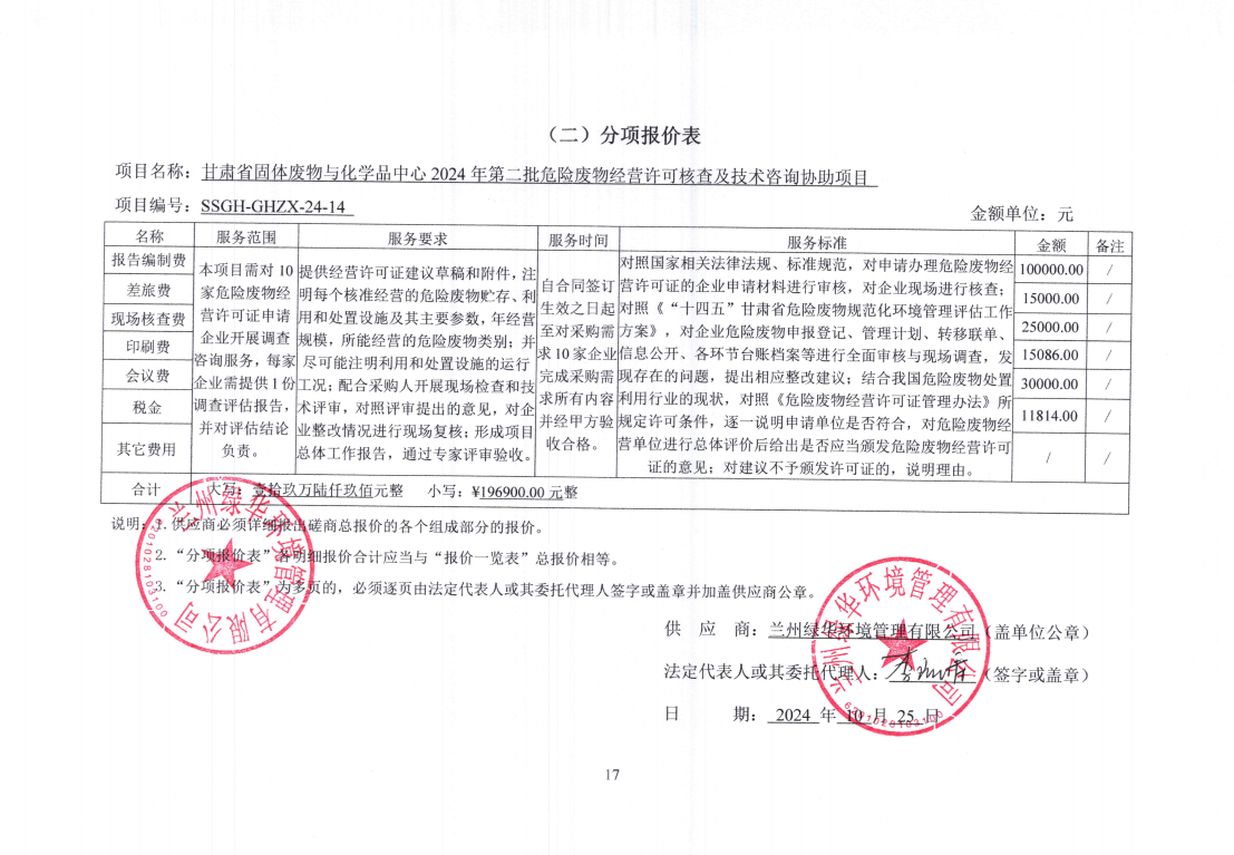兰州绿华环境管理有限公司 | 甘肃省固体废物与化学品中心2024年第二批危险废物经营许可核查及技术咨询协助项目 | 详见附件 | 详见附件 | 详见附件 | 详见附件 |