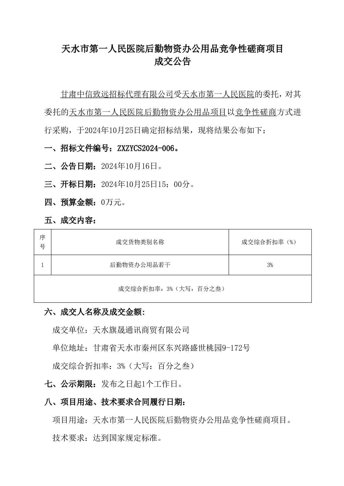 天水市第一人民医院后勤物资办公用品竞争性磋商项目成交公告