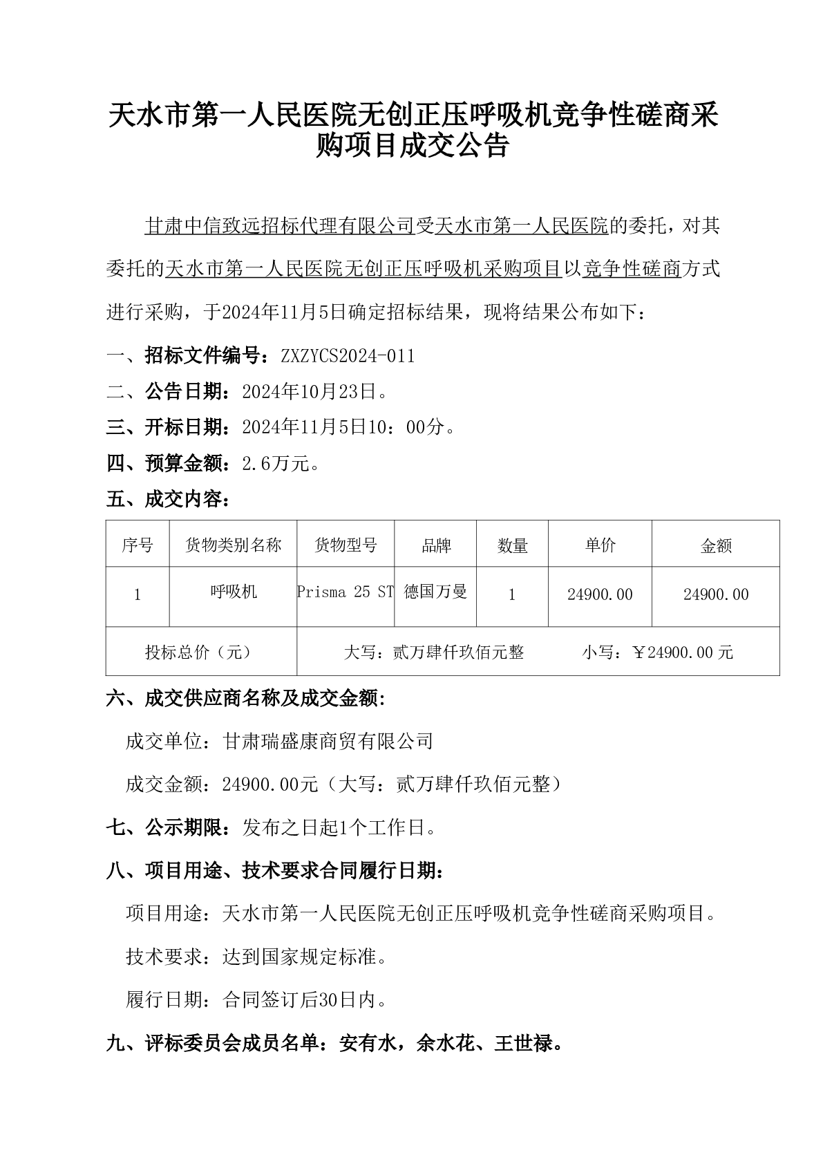 天水市第一人民医院无创正压呼吸机竞争性磋商采购项目成交公告