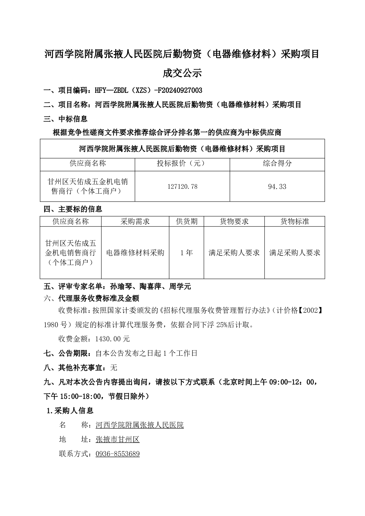 河西学院附属张掖人民医院后勤物资(电器维修材料)采购项目成交公示