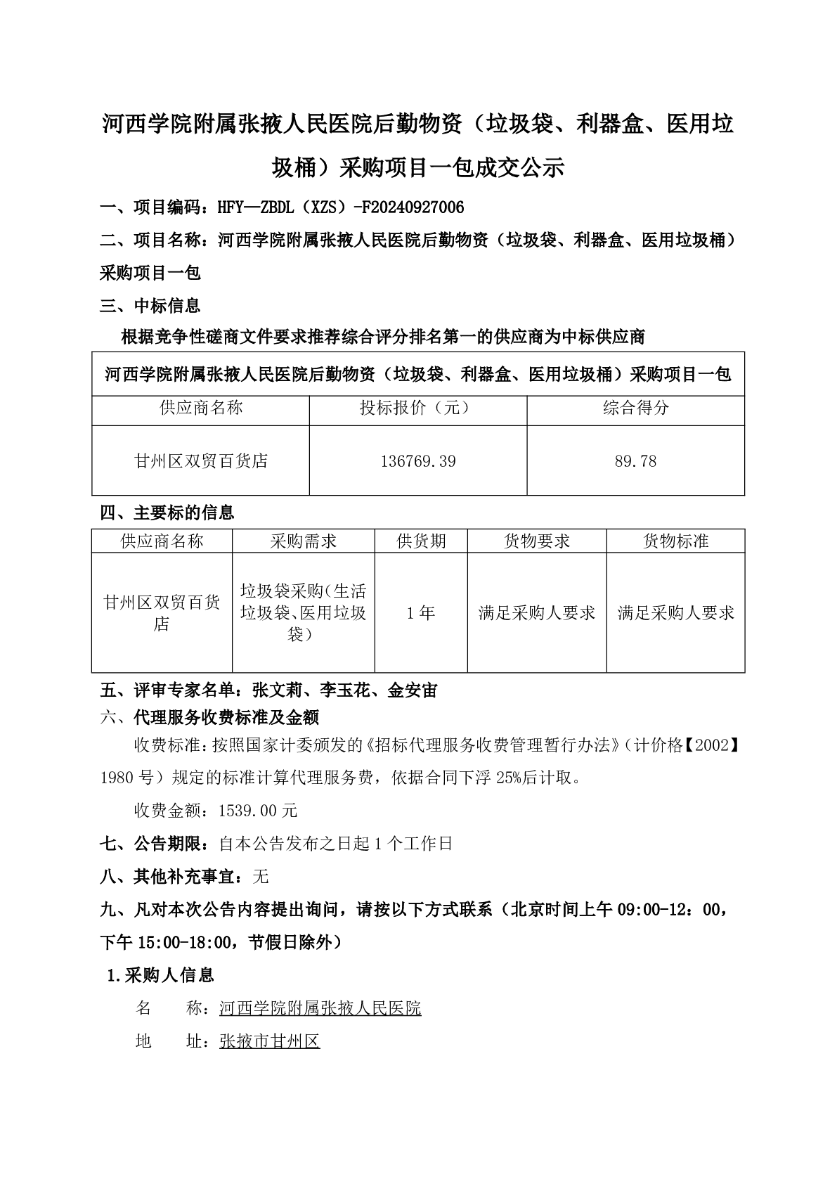 河西学院附属张掖人民医院后勤物资(垃圾袋、利器盒、医用垃圾桶)采购项目一包成交公示