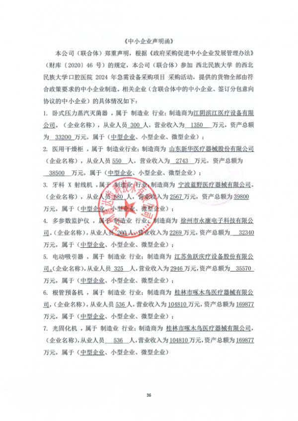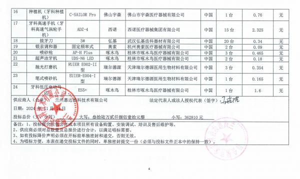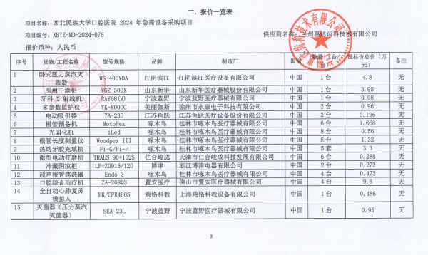 兰州西部投资咨询有限公司受西北民族大学的委托,对西北民族大学口腔医院2024年急需设备采购项目项目以公开招标的方式进行采购,评标委员会于2024年11月14日确定中标结果。现将中标结果公布如下: