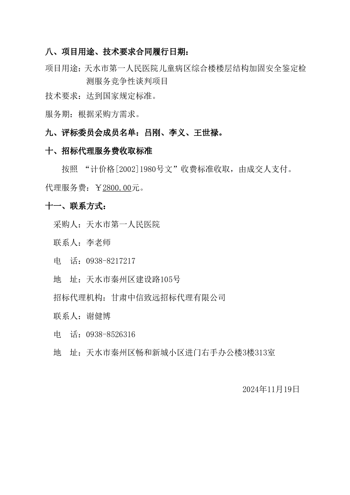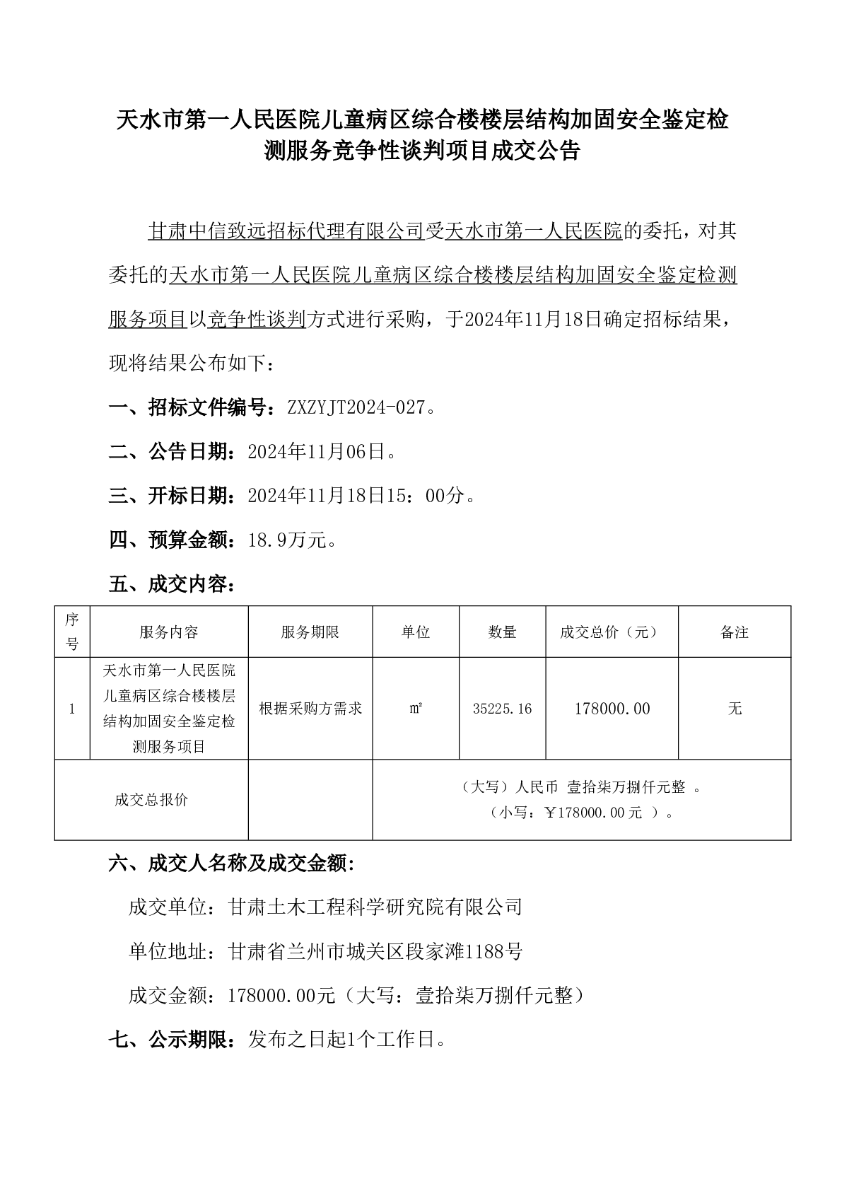 天水市第一人民医院儿童病区综合楼楼层结构加固安全鉴定检测服务竞争性谈判项目成交公告