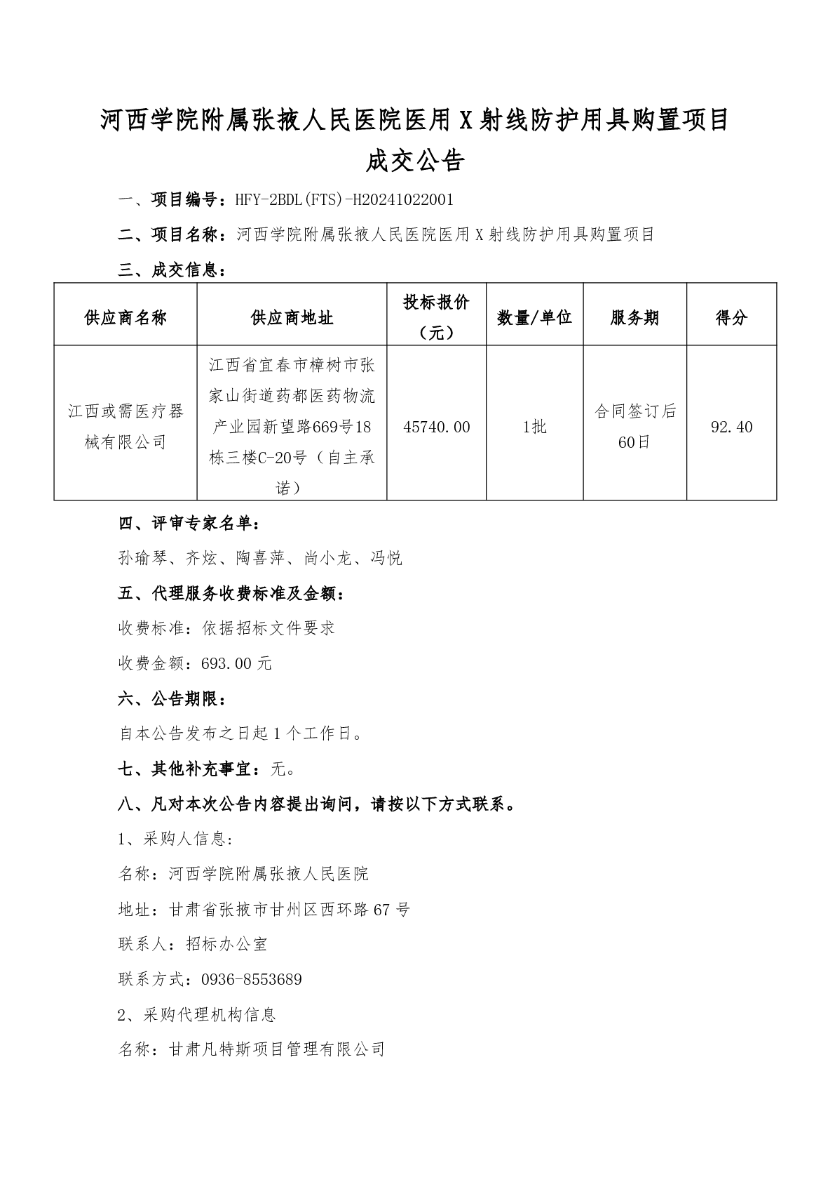 河西学院附属张掖人民医院医用X射线防护用具购置项目成交公告