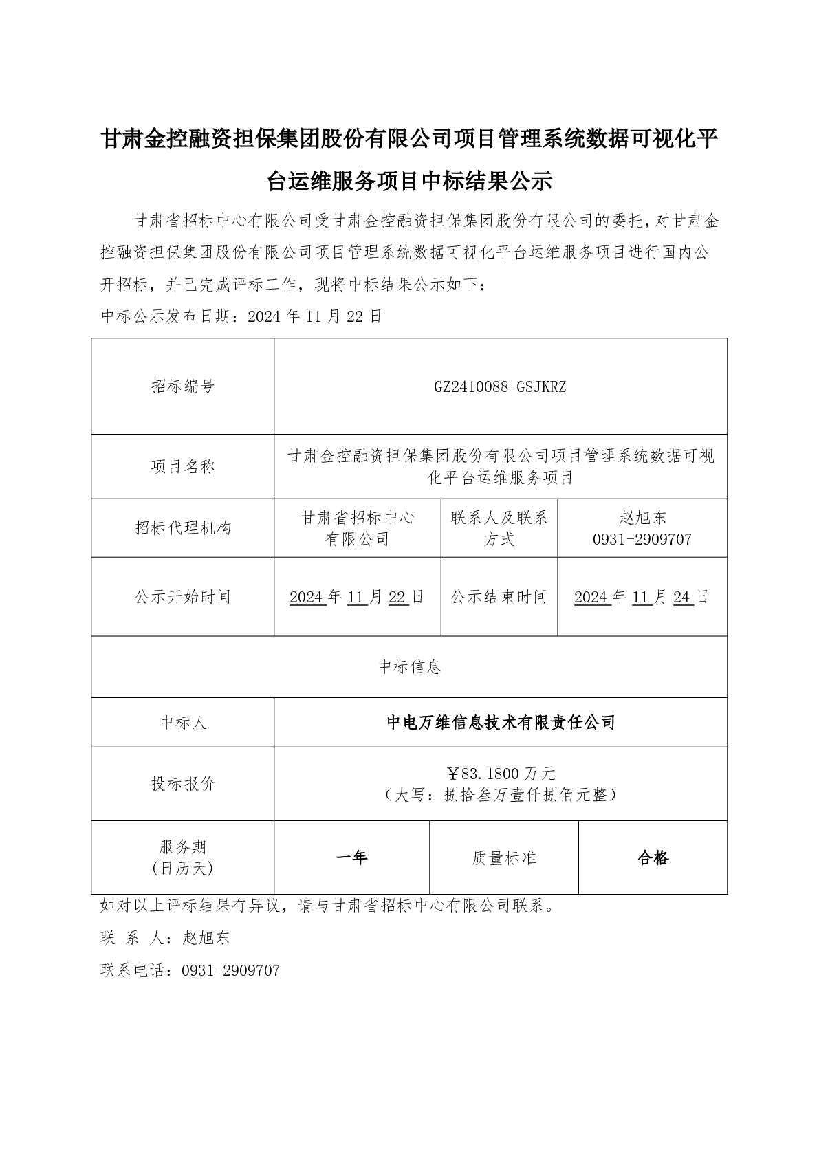 甘肃金控融资担保集团股份有限公司项目管理系统数据可视化平台运维服务项目中标结果公示