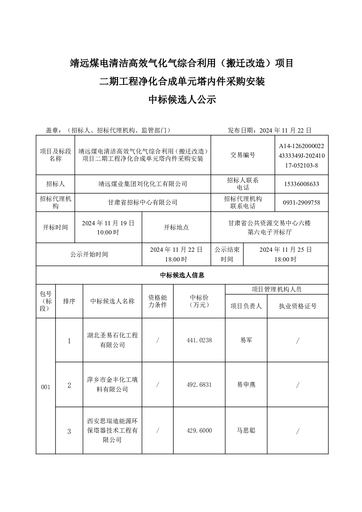 靖远煤电清洁高效气化气综合利用(搬迁改造)项目 二期工程净化合成单元塔内件采购安装 中标候选人公示
