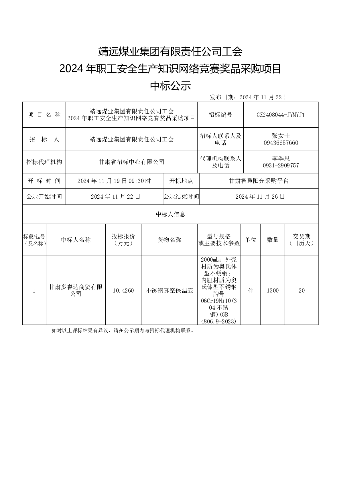 靖远煤业集团有限责任公司工会2024年职工安全生产知识网络竞赛奖品采购项目
