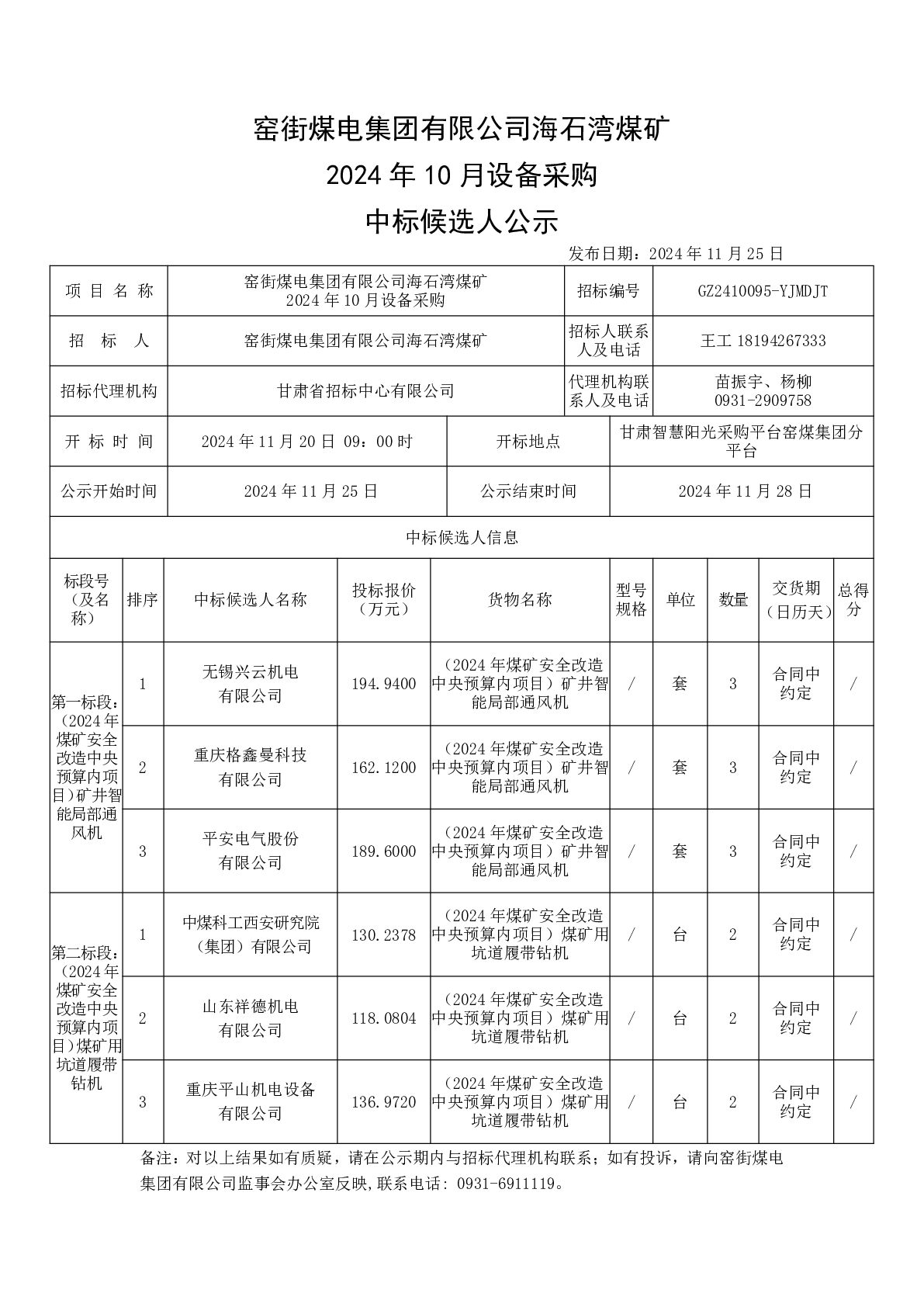窑街煤电集团有限公司海石湾煤矿 2024 年 10 月设备采购 中标候选人公示
